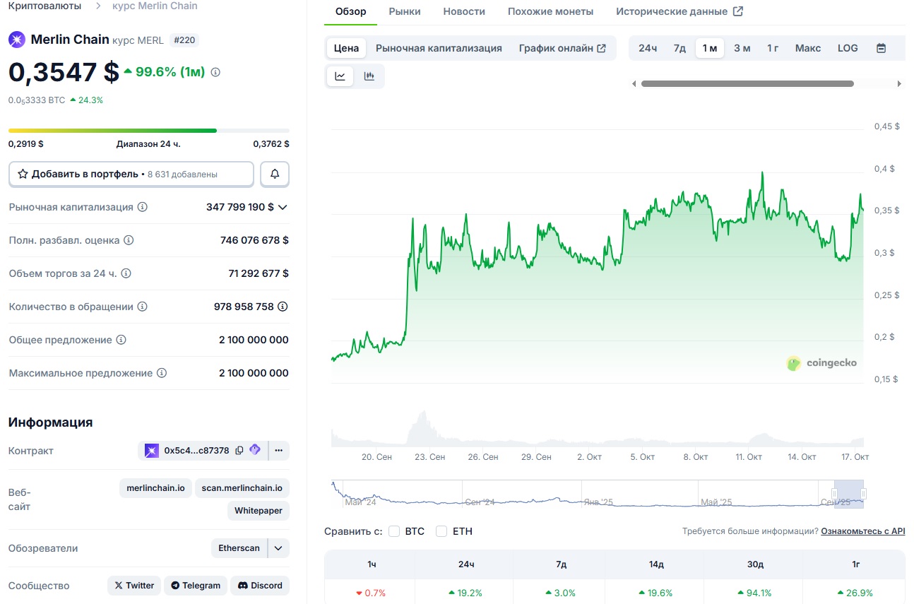 На данный момент это крупнейший Layer2 для биткоина. Наблюдаю за этой монетой уже больше года. Сейчас Merlin chain не раскручена в медиа блогерами и инфлюенсерами. Но если снова будет актуальным нарратив Bitcoin-DeFi, то можно увидеть значительный рост интереса к этой монете, как, например, было в конце 2023 года с Ordinals и токенами BRC-20.