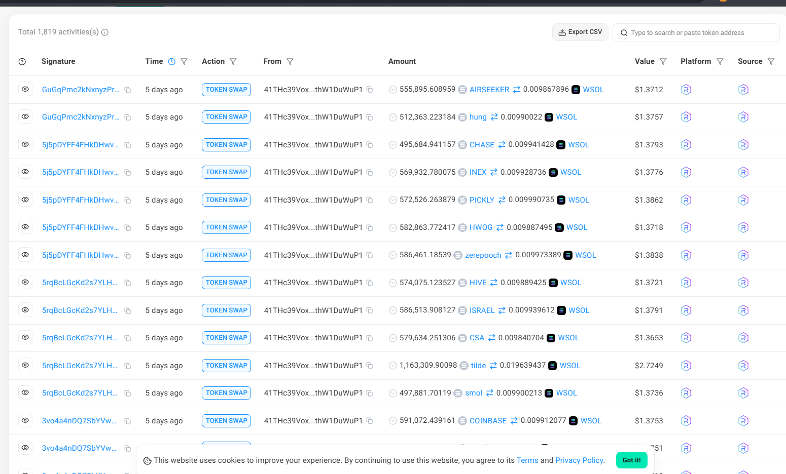 А вижу я следующее. Дохуя разных кошельков массово скупают всякую лоу капу щитки с такой же лоу ликвидностью и объёмом 1-100$ в сутки. Скупают на одинаковую сумму все щитки. Некоторые щитки скупают перед пампом и продают фиксируя ебейшие профиты, некоторые щитки скупили давно, ждут несколько месяцев, ловят памп и продают. Ещё они покупают щитки и пересылают на другие кошельки. Нахуя покупать щиток за 1$ и пересылать на другой кошелёк? Чтоб запутать след? След чего блять? Не понятно.
