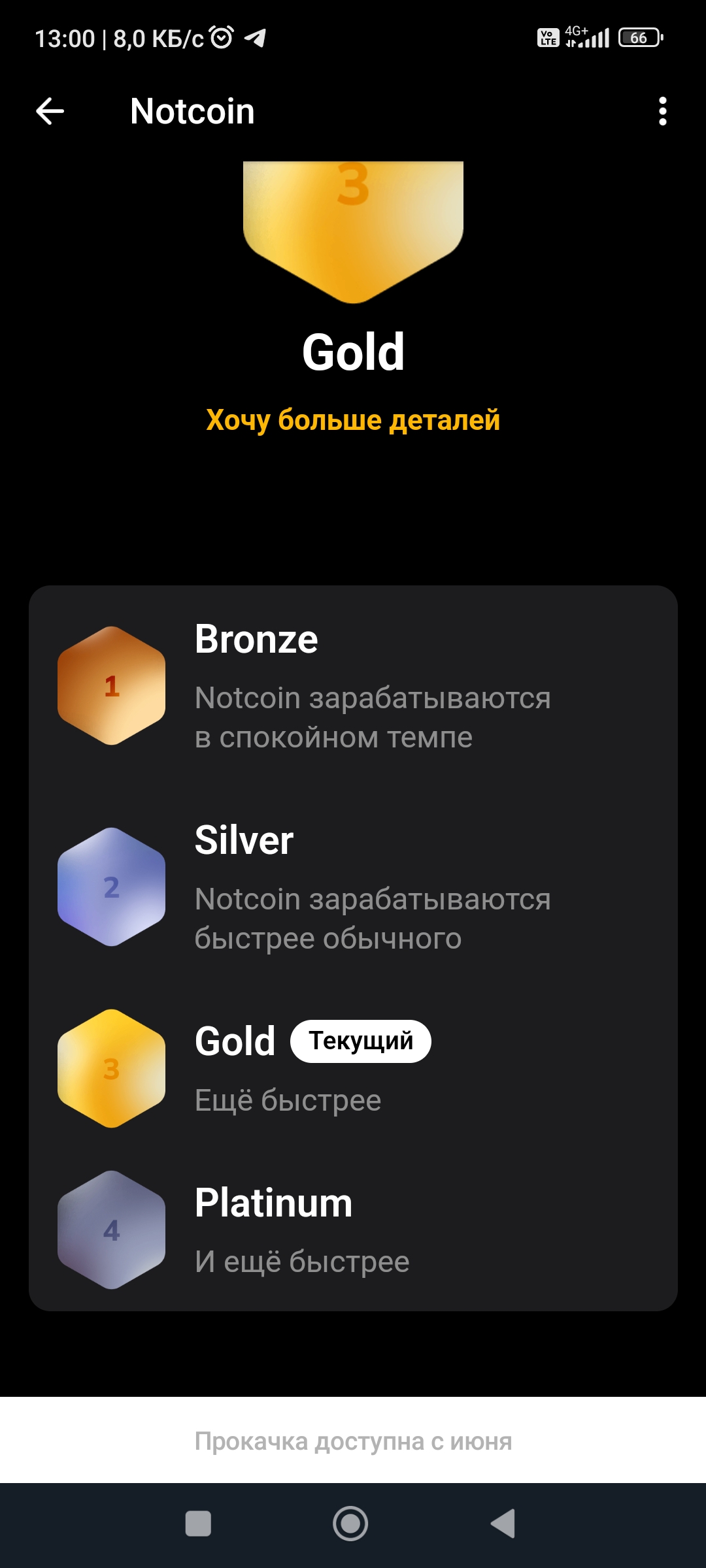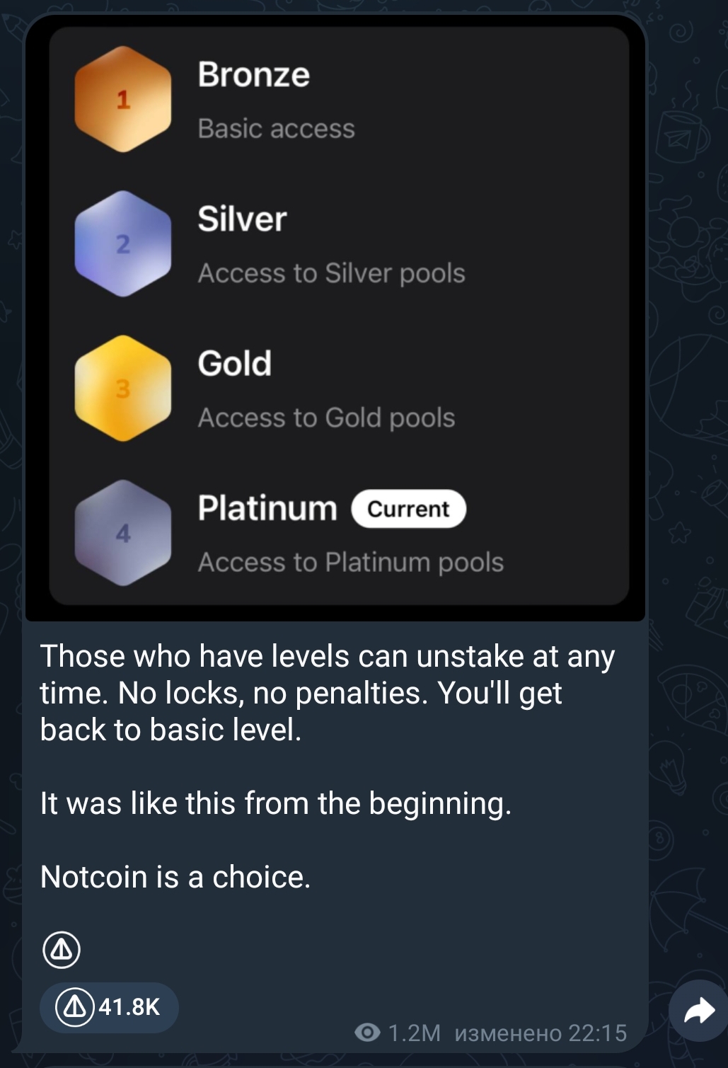 1. Ноткойн сделал 4 икса 2. Никаких изменений в боте нет, повышать статус пока не дают. 3. Выполнять задания только на комсу газа придется ждать 2 года на бронзе и 2 месяца на серебре. 4. Паша ждет цену $0.69 за 1 ноткойн