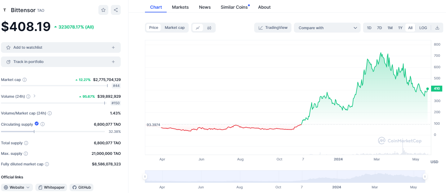 Bittensor - любимчик этого цикла, второе место после Kaspa в трендах. Децентрализованные AI/ML модели, хайповее некуда.