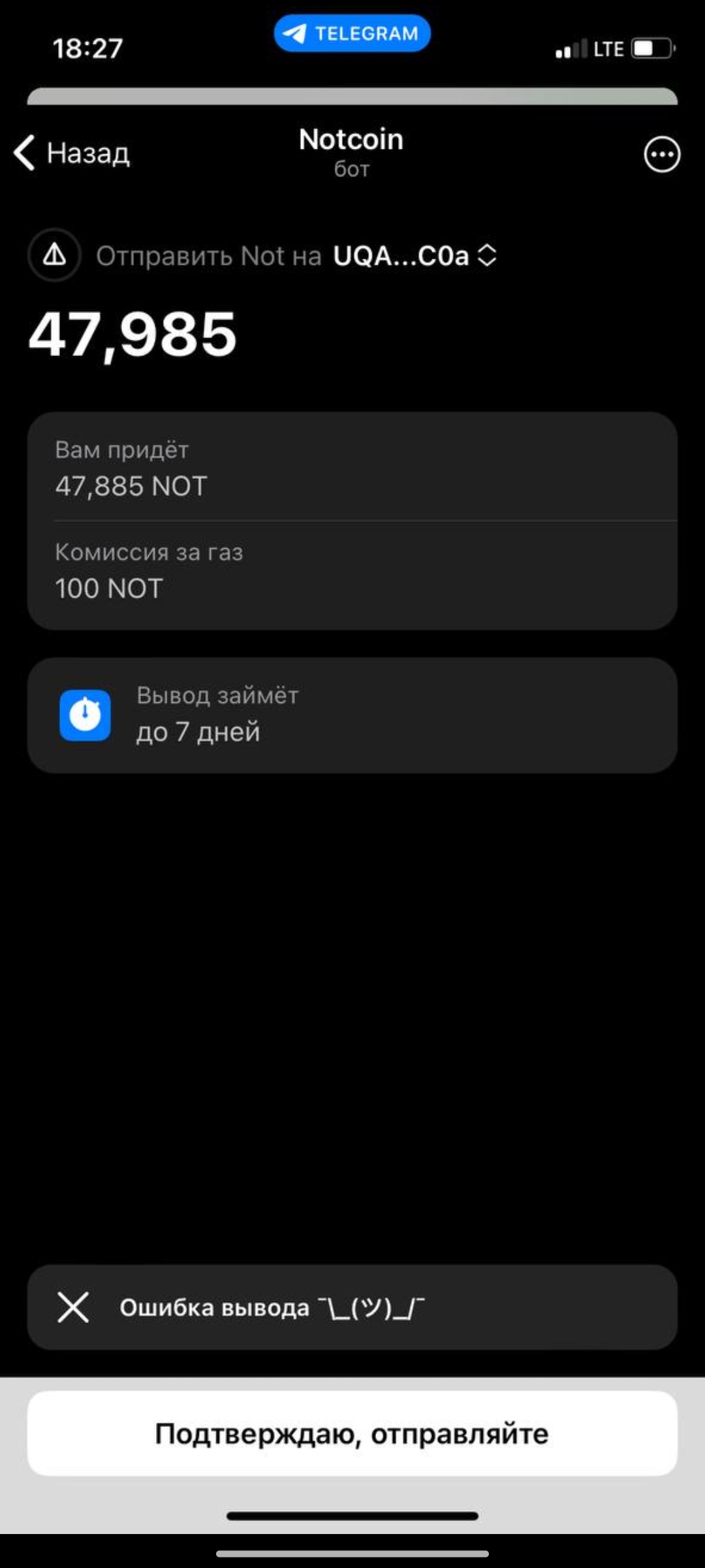 Подскажите, в тг боте у меня баланс Нота, пытался вывести его на привязанный Тонваллет за 300 монет, транза процессинга висела 9 дней, после этого меня бросило с сильвера в бронзу и баланс вернулся на кошелек, теперь вывод неактивен. Есть сеймы и что с этим блять делать?