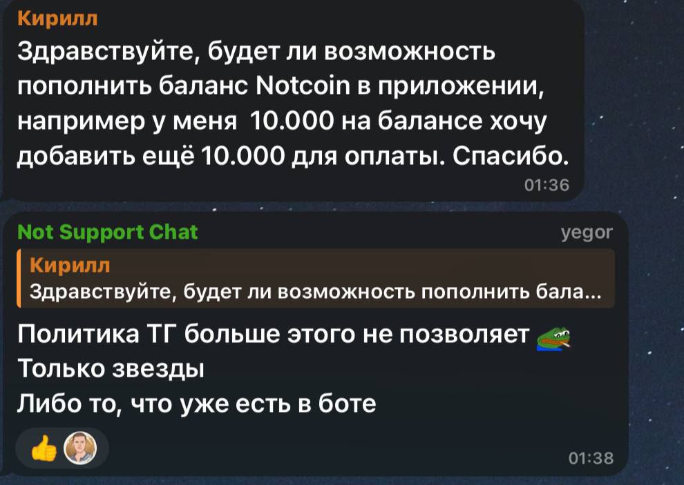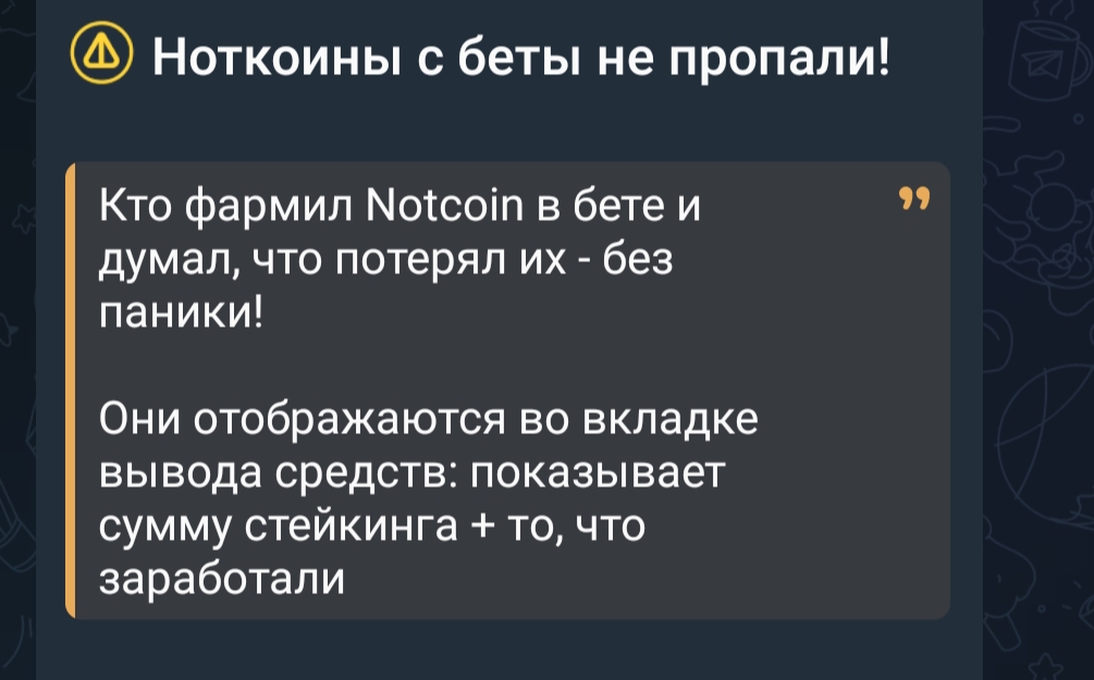 На момент создания: - Монетка стабилизировалась $0,015; - Незнайка-кун не знает; - Ничего серьезного не происходит, Саша молчит, монетка падает; - Обещают NFT за telegram stars; - Произошло значительное снижение на 18,3%, упав с $0,02071 до $0,0175 с момента окончания недавнего периода подачи заявок на раздачу в воскресенье. Закупщики рвут волосы на жопе; - Ожидаем 16.01.2024 вывода бота из beta; - Кто стейкает, обещают бесплатный уровень; - C 11.06.2024 у notcoin нет владельца; - Сяоми-кун купил телефон; - Пиво-кун попил пива; - Шаурма-кун поел шаурмы; - Notcoin сделал 4 икса; - Паша ждет цену $0.69 за 1 notcoin.