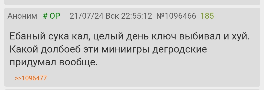 >>1100347 Даже блять с рекламой на 4 ключа не менее получаса уходит дрочки в эту блевотину. Да и велик шанс, что у тех кто не жрал рекламу ключики аннулируются, поступала такая информация от инсайдера.