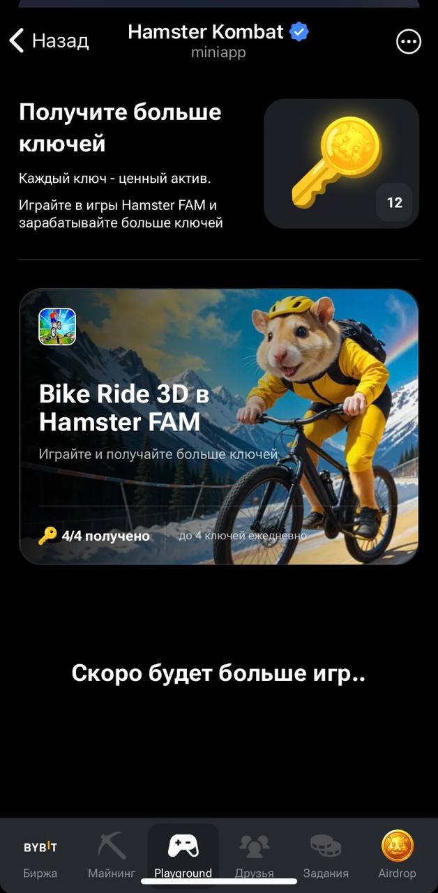 минут 40 рекламы без игры, и вот +4 ключа и минус немного самоуважения, и так ежедневно. пойду искать 10 рефа, всем удачи, и помните - хомяки это сила!