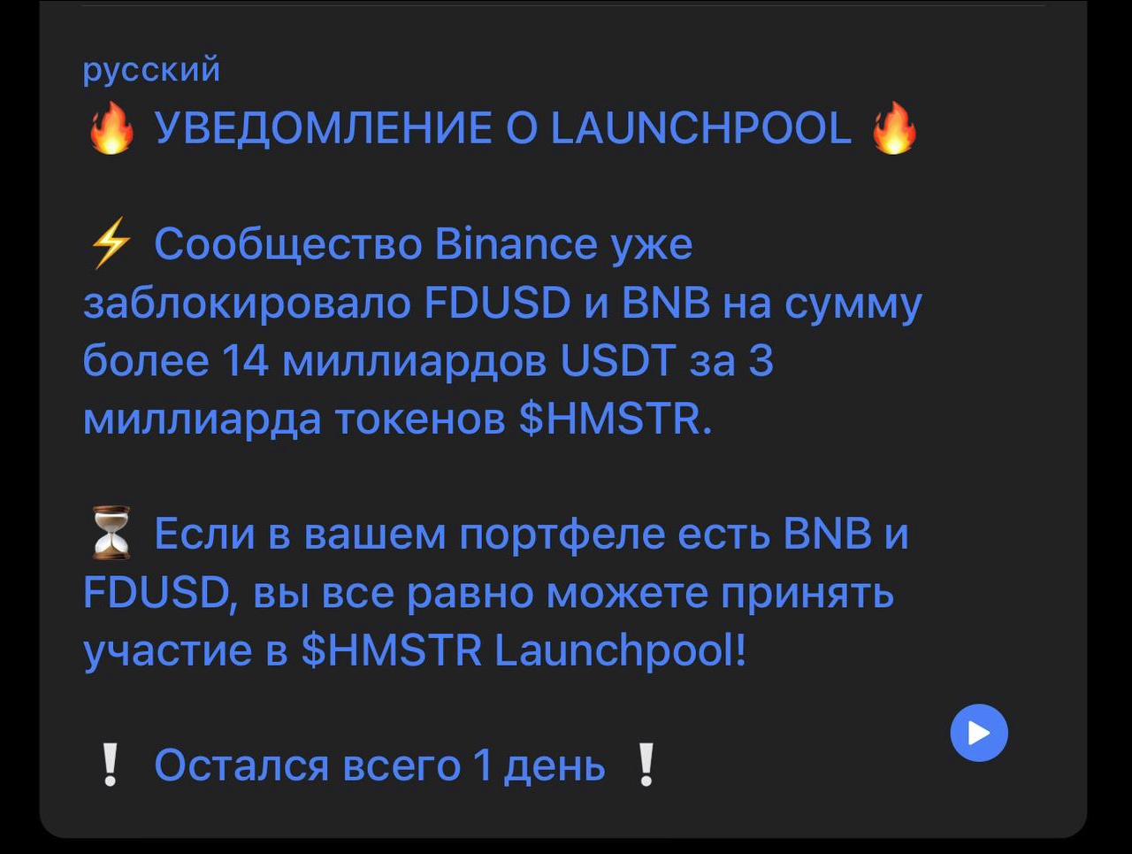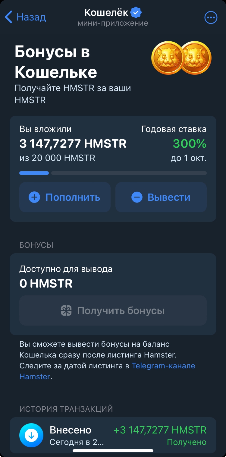 Хомяки не ссыте, крутой кит криптовейл сказал, что его друзья киты их телеграм канала сказали, что будут каждый день пампить хомяка по 10к биков в день. Скамяк будет стоить минимум 1000 долларов.