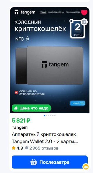 1. Ни разу не взламывался (пока), продано 2кк товаров. 2. Компания Tangem AG действительно зарегана в швятой Швейцарии. 3. Легко и дешево можно купить в РФ за 4к условно официально на Озоне, что как я понял делает лучшим для россиян. 4. Для использования нужно устройство читающее нфс чип. 5. Есть мобильное приложение с открытым исходным кодом. 6. В тангем 2.0 завезли возможность генерации сид-фразы. 7. Поддерживает много говнин и лохчейнов, даже говнеру.