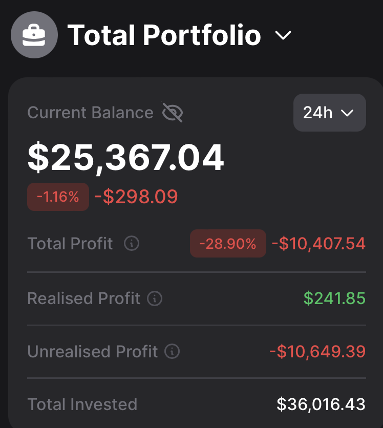 Здесь речь о реальном управлении балансом 4 года на споте, с минимальными рисками. На скриншоте: общий обьём криптопенсионного портфеля, количество монет, которые удалось накопить вкладывая по 200$ в месяц, текущий профит и средние точки входа по каждой позиции