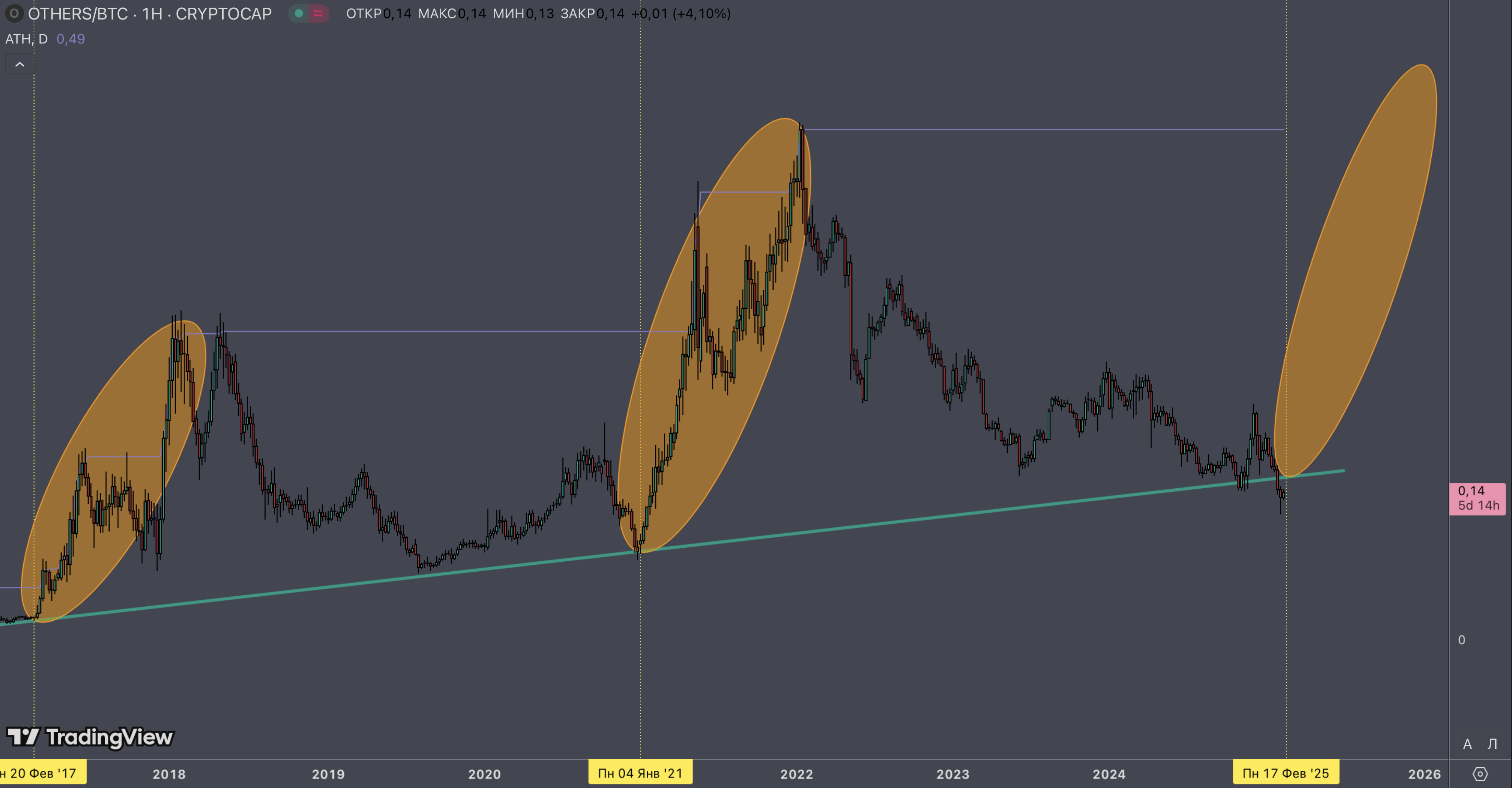 В позапрошлый цикл стабильный обвал доминации начался в конце февраля-начале марта, в прошлом цикле тоже, но, перед этим был дополнительный сильный дамп в январе, я ожидал, что пойдём по прошлому циклу и доминация начнёт падать в январе, но, выходит падение в январе на том цикле было исключением, а правилом является конец февраля-начало марта, как в обоих циклах до этого. Так что ждать осталось +- месяц, который очень быстро пролетит.