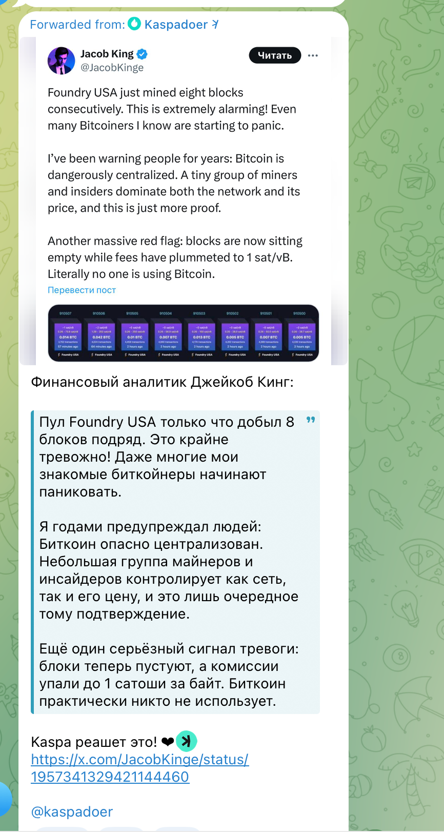 Зашел в телегу по каспе. Буквально каждая новость, каждый пропук сравнивает каспу и биткоин. 100500 новостей в оф канале, где сравнивают биткоин с каспой. Обсравнивались уже до седых мудей.