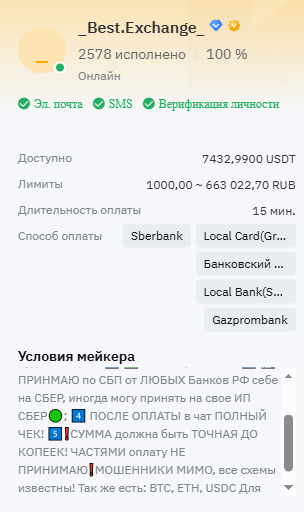 Сделки в основном от 3-лиц: белых треугольщиков и с карт доверенных лиц. Могут разбить платеж в 50к на 5-10 транзакций, поэтому уточняй заранее условия в чате. Сейчас Bybit банит аккаунты за 3-е лицо, процессинг, треугольники и разбитие платежей. На HTX белые треугольники разрешены, разбитие платежей не более 3-х.
