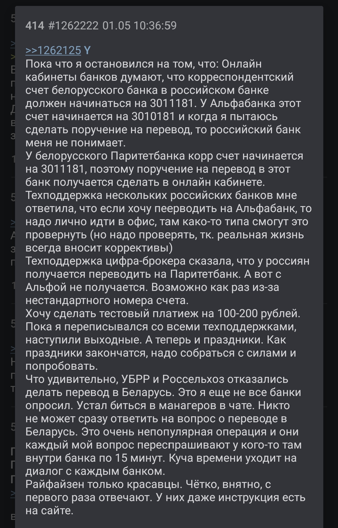 >>1270128 Цифру-брокер, с которой я связался, лучше всего пополнять через цифра-банк. Это одна мафия из Москвы, которая зарегистрировала в Беларуси шарашку по работе с криптой. Также манагеры из цифра-брокера говорят, что у россиян получается переводить через Новикомбанк. Онлайн через Альфабанк не получается (хотя на сайте Цифра-брокера эот метод тоже описан), потому что в реквизитах немножко не те цифры, которые ожидает увидеть онлайн-банк и поэтому система отфутболивает попытку платежа. Надо идти в офис и там типа помогут.