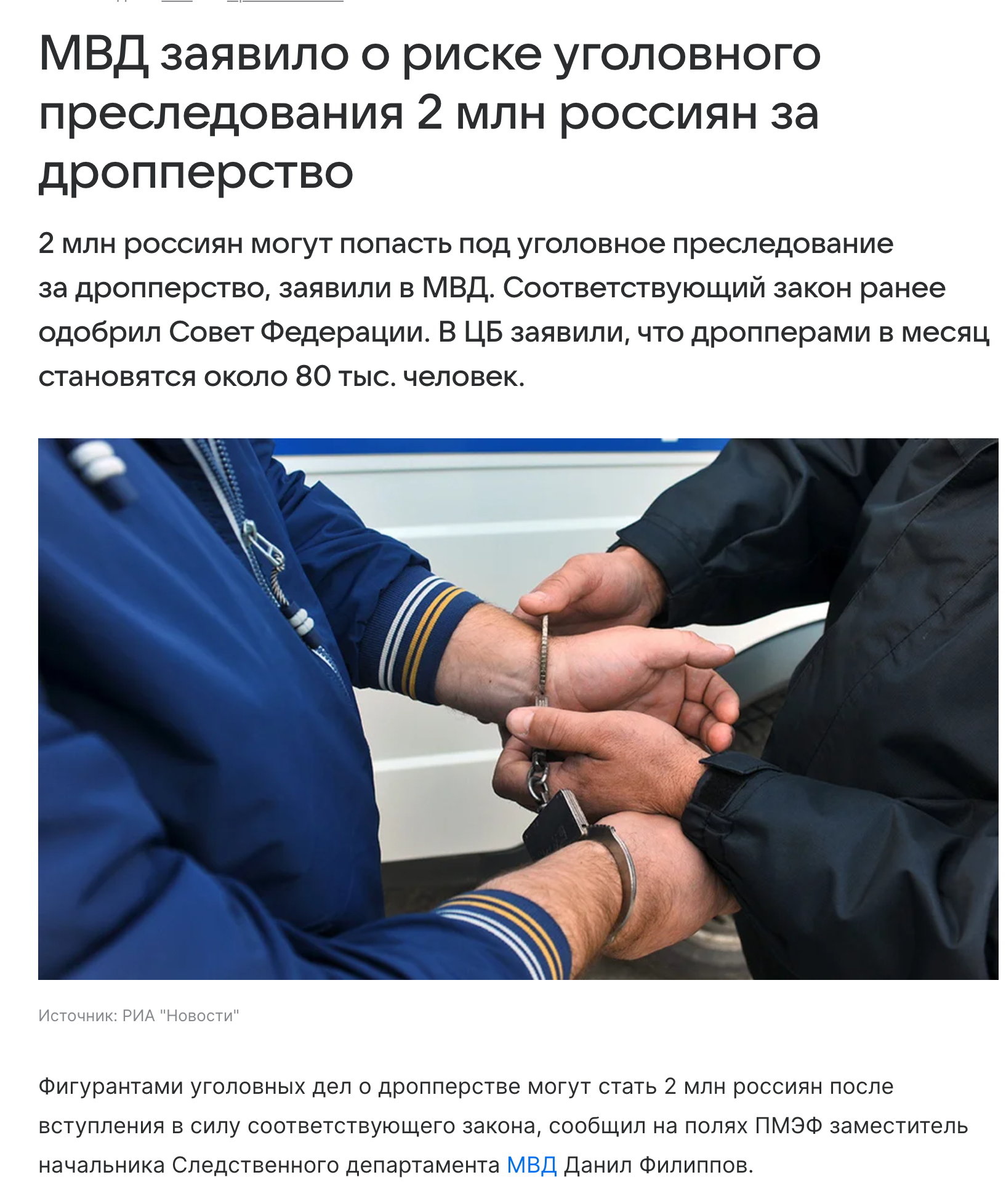 Анон, мне часть зарплаты платят usdt. Раньше каждую неделю выводил маленькими суммами по 20-30к рублей себе на карту через wallet телеги, чтобы избежать проблем. Как я понял в связи с уголовкой для дропов, уже даже если малым суммами себе выводить будут проблемы с банками и лучше так не делать? Я, если что, не в теме.