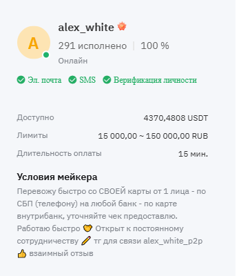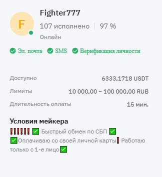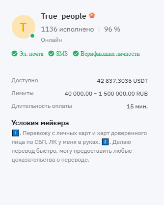 Сделки в основном от 3-лиц: белых треугольщиков и с карт доверенных лиц. Могут разбить платеж в 50к на 5-10 транзакций, поэтому уточняй заранее условия в чате. Сейчас Bybit банит аккаунты за 3-е лицо, процессинг, треугольники и разбитие платежей. На HTX белые треугольники разрешены, разбитие платежей не более 3-х. Есть риск банковских блокировок, 115-ФЗ и 161-ФЗ.