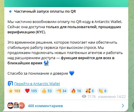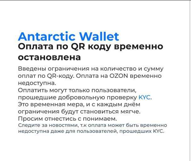 https://antarcticwallet.com/ https://t.me/antarcticwallet Есть комиссии на пополнение в USDT, нет комиссий по оплате QR. Есть выборочный KYC, есть AML. Нет пополнения через смарт-контракт, такое зачисление уйдет в долгий ручной ввод. Можно так же пополнять Steam по курсу 1USDT=$1, комиссия - $0.5. Быстрое пополнение с байбит. Оплата по QR-коду проходит в течение 10 сек.