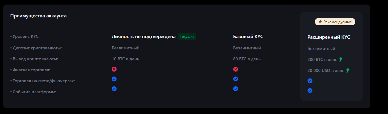 >С биржи плати, а не с кошелька. Я понимаю, что монеты после биржи считаются чистыми. Но а если кошелек новый и деньги на него придут с биржи, это уже считается плохо? Алсо, я что-то слышал про то что наоборот, нельзя использовать биржевой адрес для оплат/обменов (да, слышал звон, но не знаю где он). >Можешь сделать себе Non-KYC аккаунт на Мексе Не то что бы ищу без KYC (хотя заморачиваться еще и с верификацией конечно не хочется), но раз уж ты упомнял, то вот пикрил, судя по всему KYC там требуется.