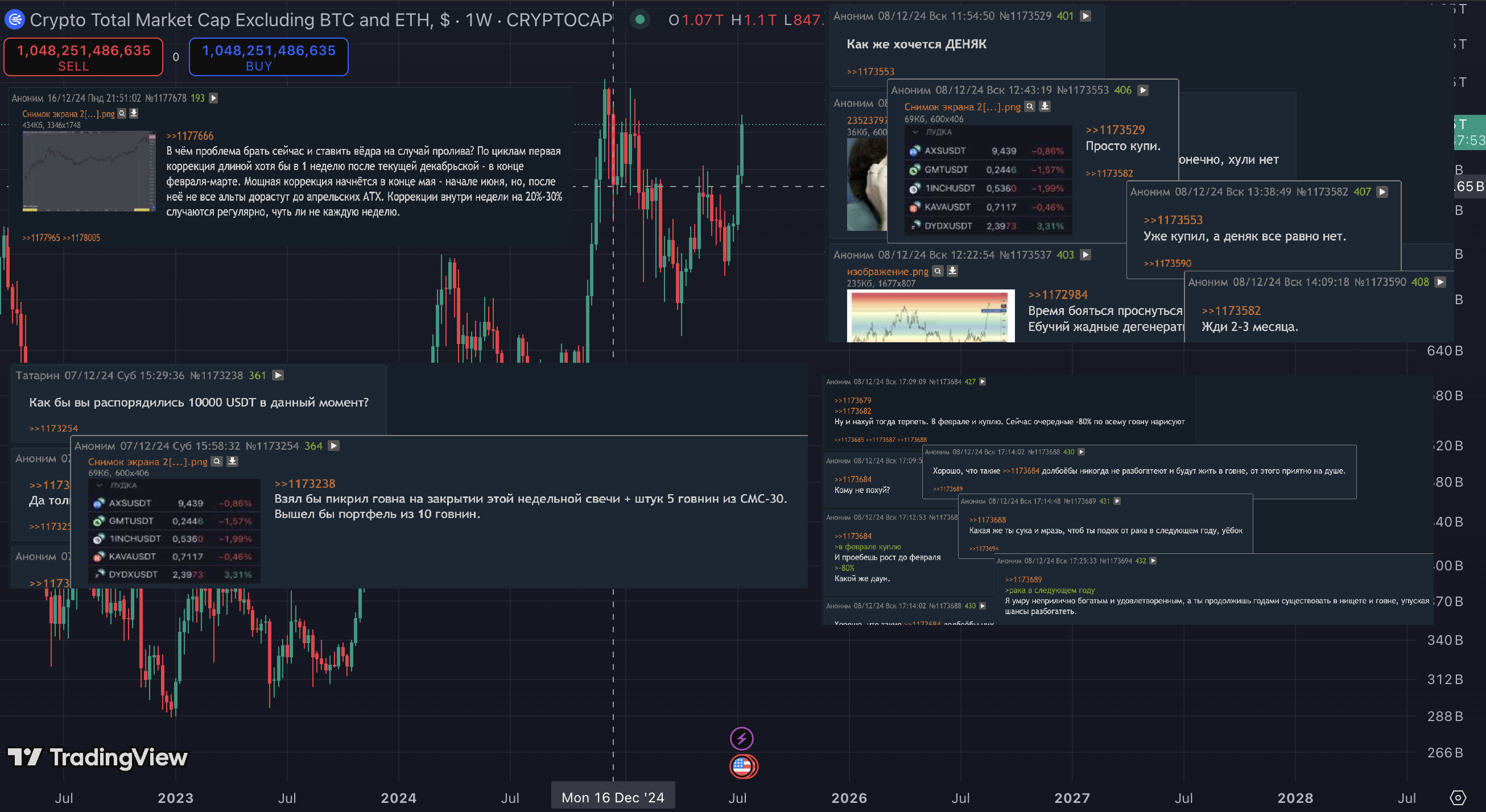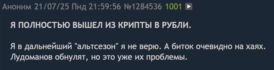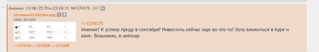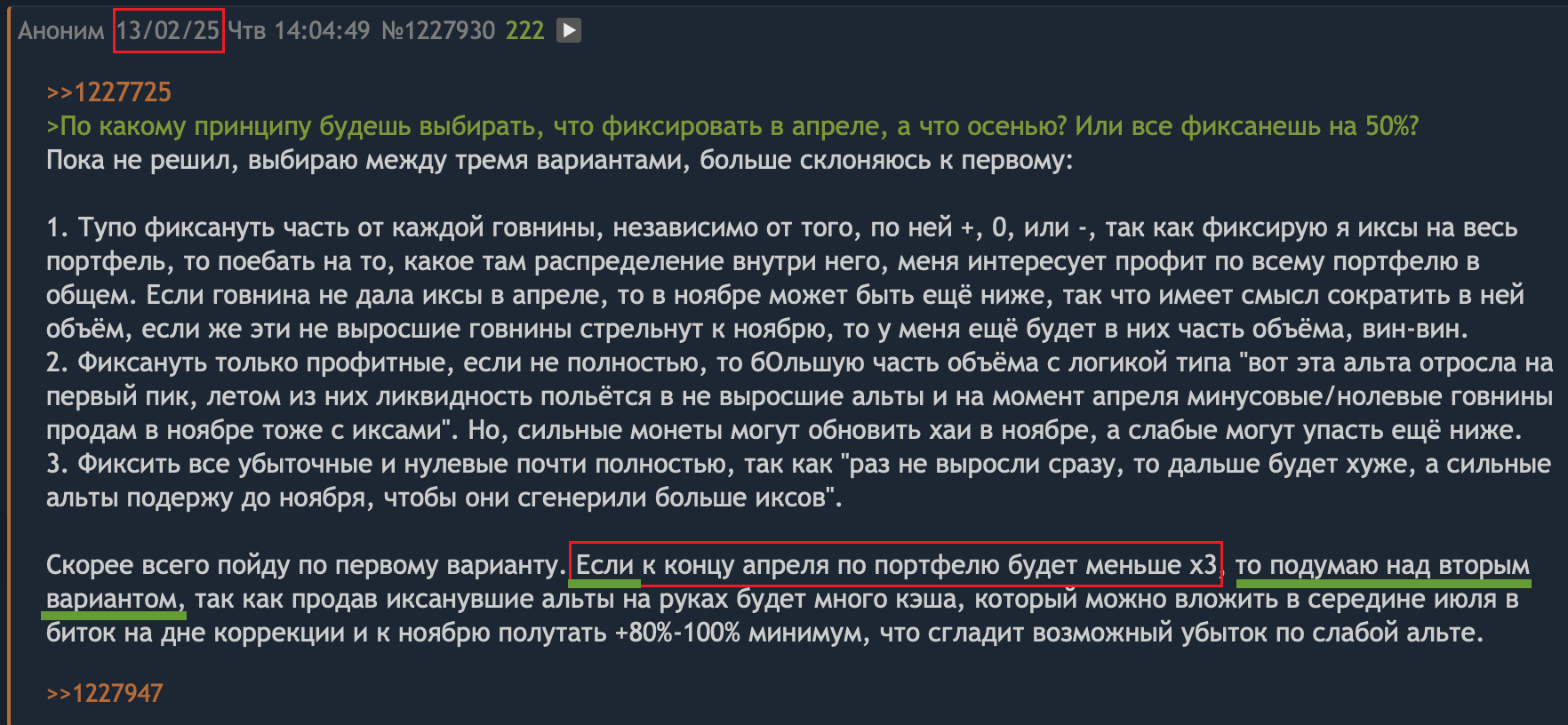 >>1303985 >из-за попыток доказать что-то случайным людям в интернете Эм, нет. Я альту покупал и держу не для трясущихся лудиков в треде, а для своего обогащения. Я в изначальных тредах писал, что рассматриваю треды как дневник + показать, что инвестирование это выгодно. Пару месяцев назад мне надоело одно и то же визгунам объяснять, тем более когда цикл у своего финала, где рынок и сам всё покажет, так что забил. Сейчас написал из-за экстраординарного события, дальше снова пропаду до конца цикла. > просрал деньги Значение знаешь? Вопрос риторический. > говоришь, что это копейки, при этом в этом же тексте ты пишешь, что взял их в долг Это копейки в контексте желаемого мной лайфченджа, но много относительно моих возможностей без привлечения внешнего финансирования, тут нет противоречия. > Я сам как ты закупился криптой в 2021 на почти хаях Я не закупался в 2021 на пике цикла. > нужно никому палить свои сделки, из-за публичности ты начинаешь пытаться кому-то что-то доказать Тут налоговой нет, можно и палить. Более того, 90% визгунов и так уверены, что портфели наёбошные. Если бы я что-то доказывал, то скакал бы из монеты в монету, как Бабкашиз. У меня есть стратегия, которой я начал следовать ещё до начала моих постов даже в закрепе и по ней же иду дальше. >>1304015 Не очень, я не часто захожу и мне лень один и тот же визг скринить. Штуки 4 сделал на проливе и всё. Если хотите, то делайте свои папочки для запечатления финальных месяцев цикла.
