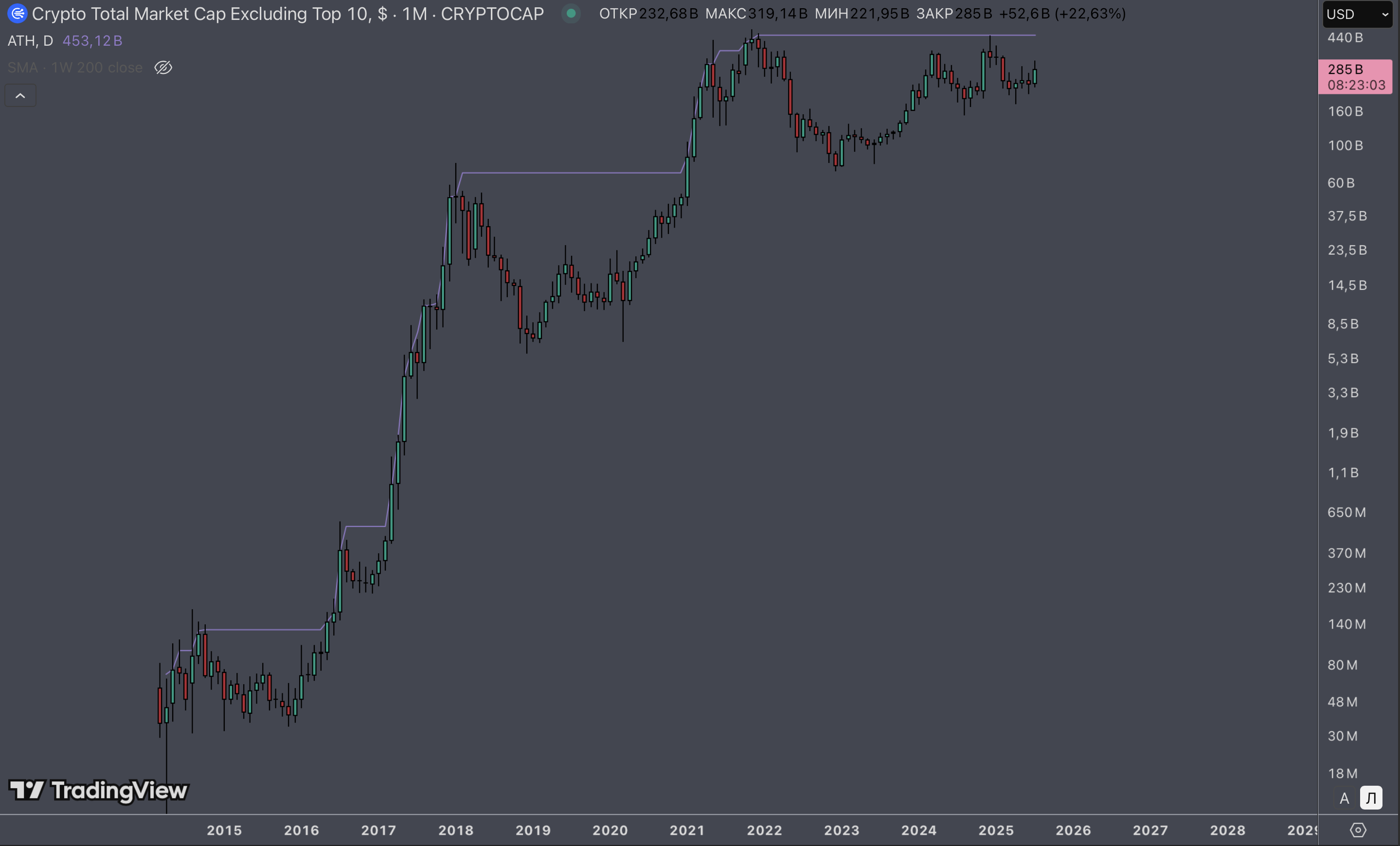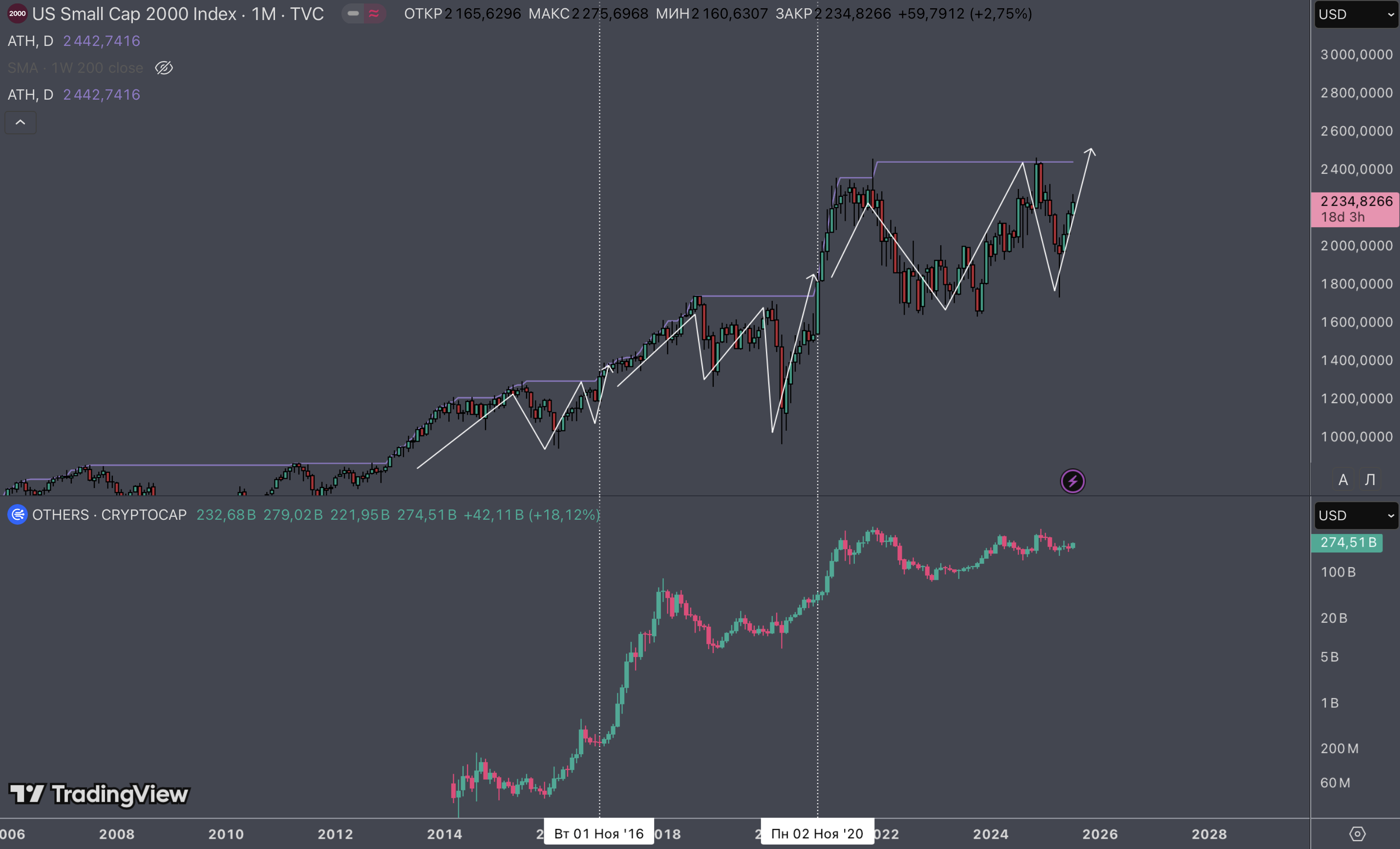 На следующий цикл подспизжу у Шизоидного Инвестора идею с корреляцией Рассел2000 и альты. Рассел всегда сильно корректируется в какой-то момент, потом доходит к прошлому АТХ, но, не пробивает его, а уходит на вторую коррекцию, после чего пробивает старый АТХ и идёт делать новые. Момент пробива АТХ и закрытие месячной свечи выше = начало бесконечного роста альтговна почти без коррекций. Есть вариант для более жадных – не ждать закрепа Рассела для входа в альту, а заходить в неё во время второй коррекции Рассела, выкупая падение альты частями.