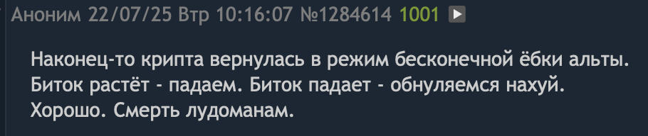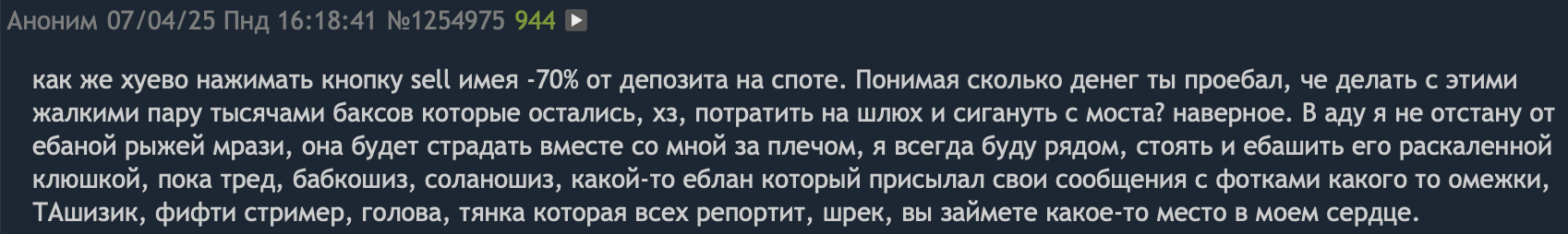 Как же хорошо, что я в апреле слил сумку со шрекоговном и закупился базированными альтами исключительно из топ 20 смс. Уже хотя бы отбил минус, пусть и без иксов. А этой чмоне теперь остается только коупить.