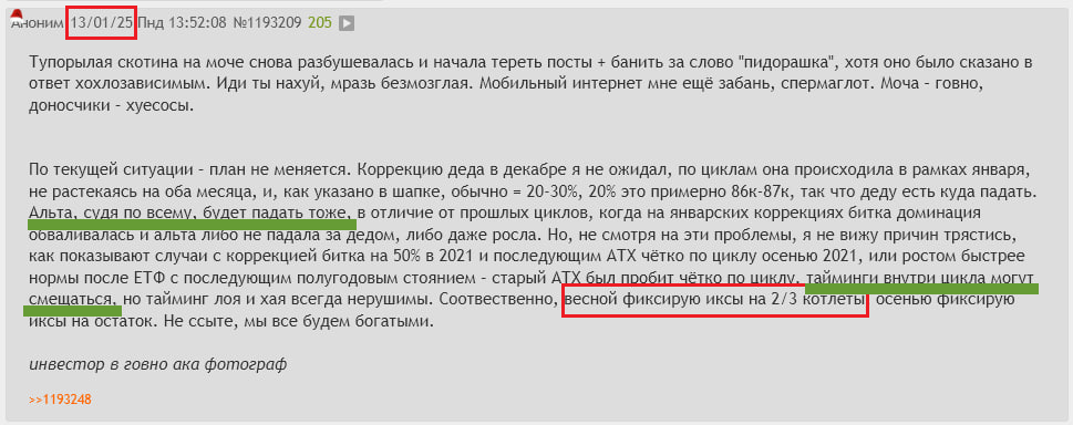 И это только пруфы прямого засаживания людей в альту на хаях. Если почитать эти треды, то зеленая хуйня смеется над теми, кто не согласен с его маняпрогнозами, вплоть до перехода на агрессивный нахрюк. В тех же тредах легко видеть, как большинство его прогнозов оказываются чушью.