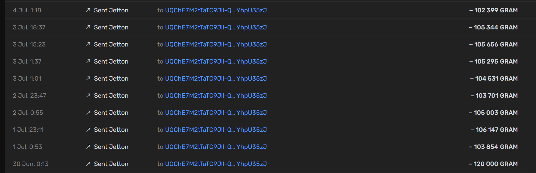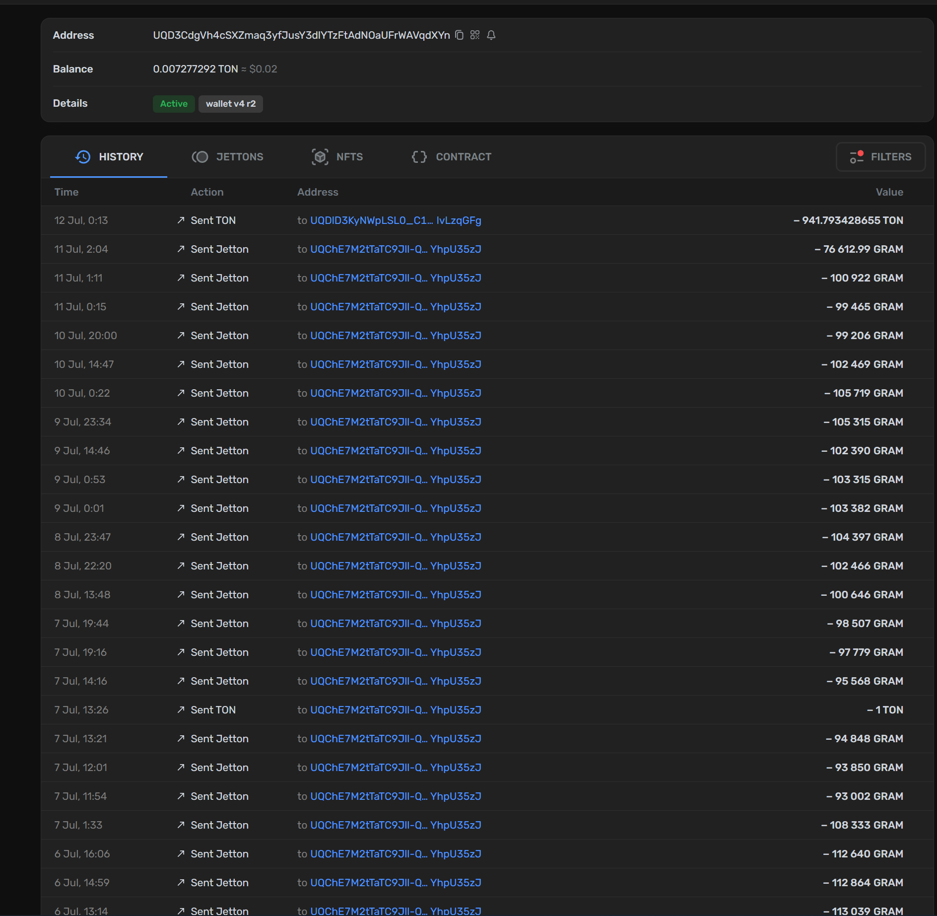 >Это вы хорошо напомнили о ББШ. Зашел на его тоновский кошель. >Оказывается, он с конца июня каждый день выводил грам и 12 числа вывел тоны. >Вот и все... Конец его истории, деньги на ПВЗ отжали пацаны, блокнули в телеграм канале своем, ягуар пришлось продать. А теперь и грам с тоном продан в минус. >Занавес.