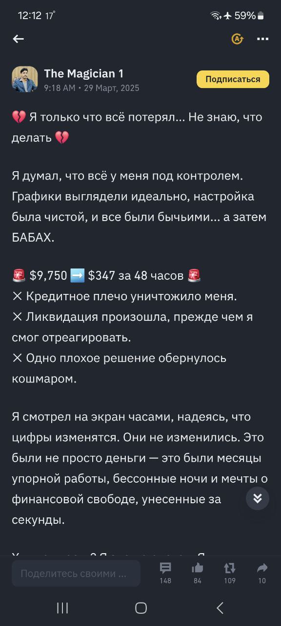 >>1303926 Бля Шрэк неиронично советую тебе сходить к психологу бро. Ты из-за попыток доказать что-то случайным людям в интернете влез просрал деньги, довольно большую сумму, хоть ты и говоришь, что это копейки, при этом в этом же тексте ты пишешь, что взял их в долг, то есть денег больше у тебя не было. Я сам как ты закупился криптой в 2021 на почти хаях и сидел всю медвежду ждал роста. В декабре 2024 был шанс все слить и зафиксировать почти 2х. Но как ты и сказал пришел оранжевый маразматик и похерил циклы. Сейчас у меня прибыль 10% за 4 года ожидания и я просто жду 1 ноября солью все и буду ждать дно в 2026 для закупа. Не нужно никому палить свои сделки, из-за публичности ты начинаешь пытаться кому-то что-то доказать, что может привести к печальным последствиям, если рынок пойдет не в твою сторону, что и произошло. Короче я желаю тебе чтобы у тебя все получилось задуманное, но не надо больше заходить на эту доску и пытаться перед всеми отчитаться - это потешно выглядит, когда ты показываешь что у тебя полдепозита убытков, так еще ты теряешь из-за этого деньги.
