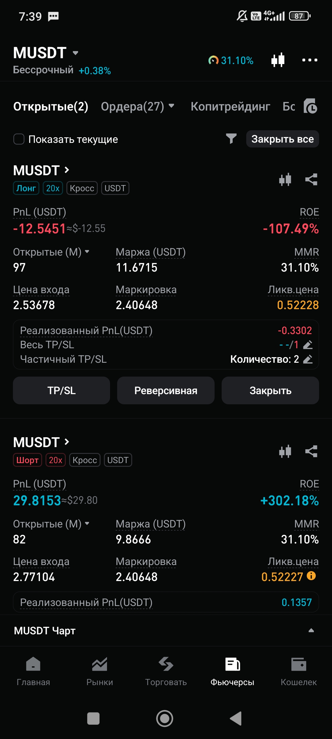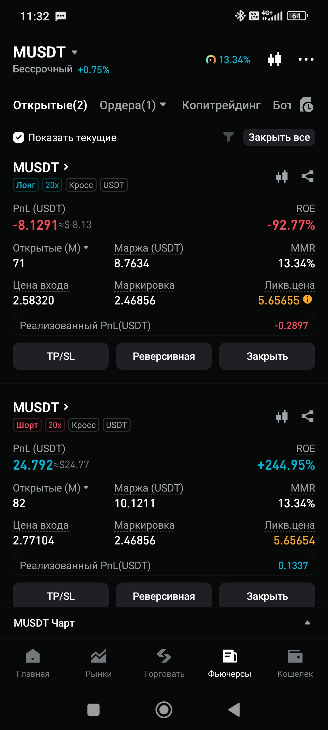 Верхний ордер был по стоимости как нижний, но он дал х2, я половину закрыл, осталось вот 10 центов дальше куда-то рвëтся иксовать, чем исправно хеджирует в два раза большую позицию.