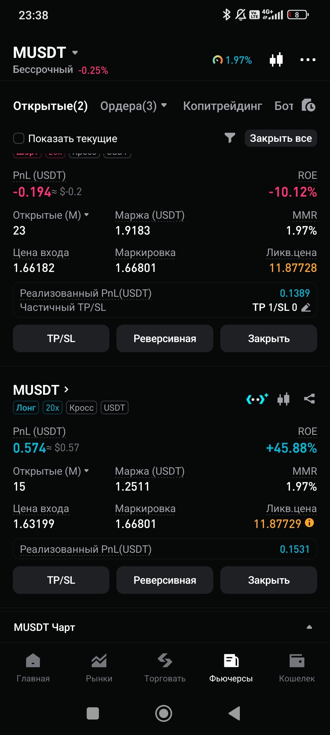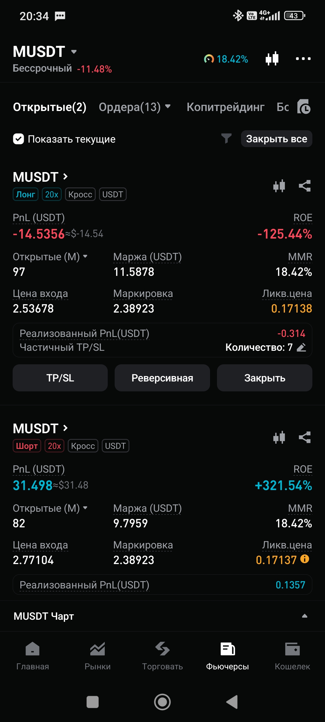Теперь я вот что провернул. 2/3 шорта закрыл и захеджировал остальную прибыль лонгом на равную позицию, буду переставлять точку входа, против которой пойдëт цена. Скорее всего, лонг придётся переставить . Ну мне уже похую, пока я ничего не делаю - баланс стабилен. До ликвидации очень далеко.