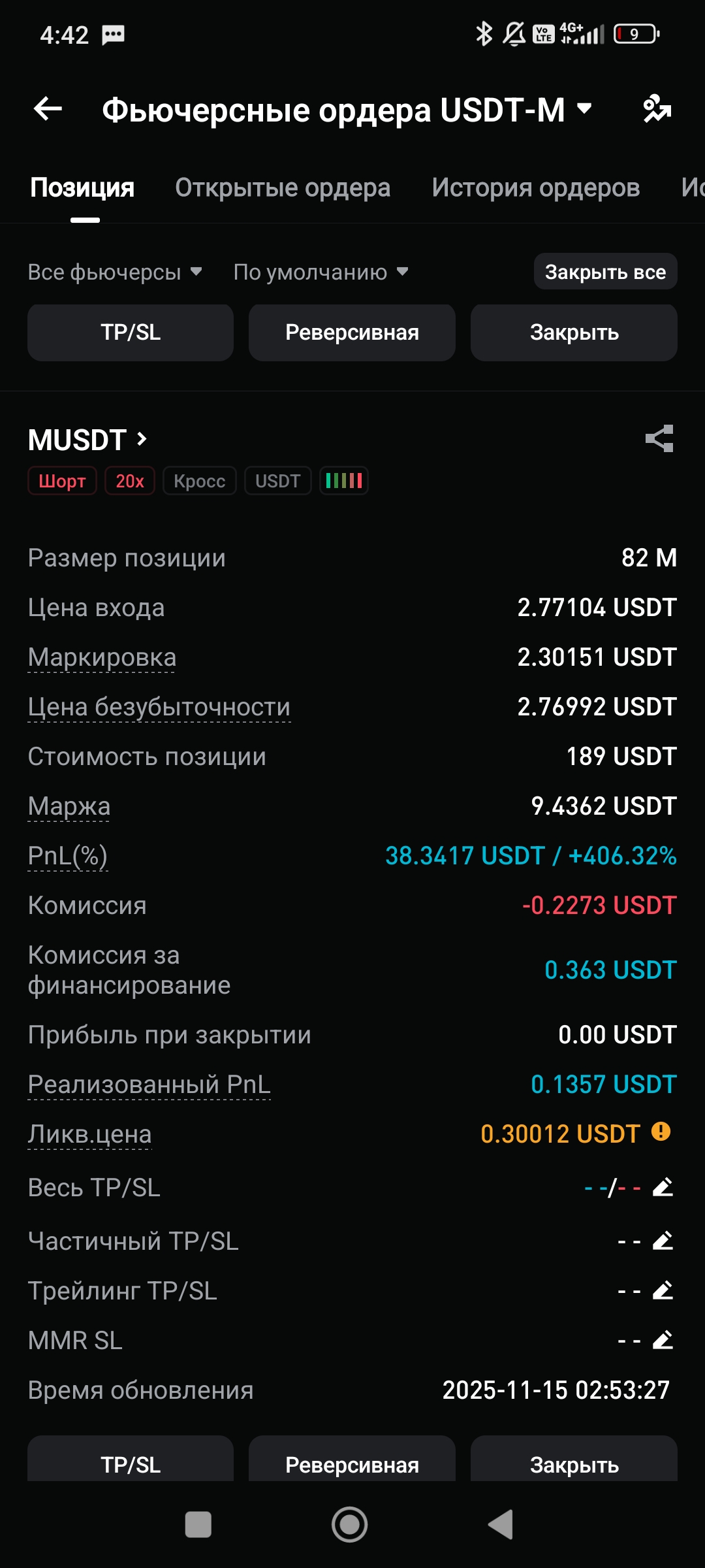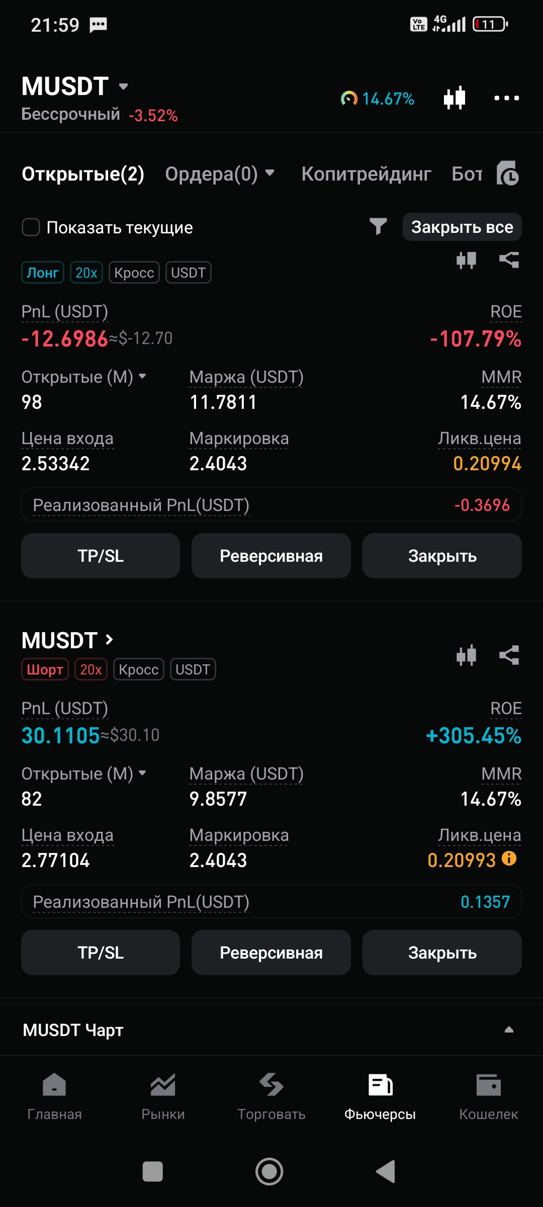 Я понял, как мне действовать в среднесрок. Есть два сценария. 1)Маловероятный. В течение ноября пойдëм на новый атх. Тогда ничего не делать до той поры, лонг у меня и так чутка больше шорта. Закрепить шорт повыше большим объëмом, когда перехаимся. 2)Более вероятный. Отыгрываю сценарий медвежки ближайшие полмесяца, с малым риском перемещая вниз средний вход в лонг, понемногу, по копеечке забирая по ~ 1% в день в USDT. В прошлый раз, когда мемкор стучался в 3$, далее он ëбнулся до 1,8 и потом до 1,58 на трампыниной движухе. Т.е. выше 1,5 цену ликвидации повышать категорически нельзя, а в идеале держать на 0,5-1$. За пару недель перемещу вход в лонг примерно на 2$, а потом, с 22 ноября и в течение месяца, пока будет идти хакатон, вполне реален рост до нового хая. Ставлю на рост после коррекции до 3,5 либо выше. Я уже дважды был точен в прогнозе по мемкору. Летом, когда шли охуевшие иксы и 7 ноября, когда повторно протестировали хай (насчëт 7 ноября, тут я заранее угадал всё: дату - ну тут несложно, именно 7 была разогревающая вечеринка, максимальную цену, дальнейшее падение и его причины - слив халявных монет после раздачи). Надеюсь, чутьë не подведëт и на этот раз. Второй сценарий лучше. Я тогда без тряски сделаю х2,5 депозита за ноябрь (х1,7 уже сделал 7 ноября за 1 день) и повторю это в декабре, без ежедневной суеты, как по предыдущей интрадей стратегии. По первому сценарию беру максимум х2 за ноябрь, он не так и выгоден. Надо пониже сходить перед хорошим лонгом. Всё же думаю, слабые руки и медведи сделают всë за меня и всё же реализуется сценарий 2.