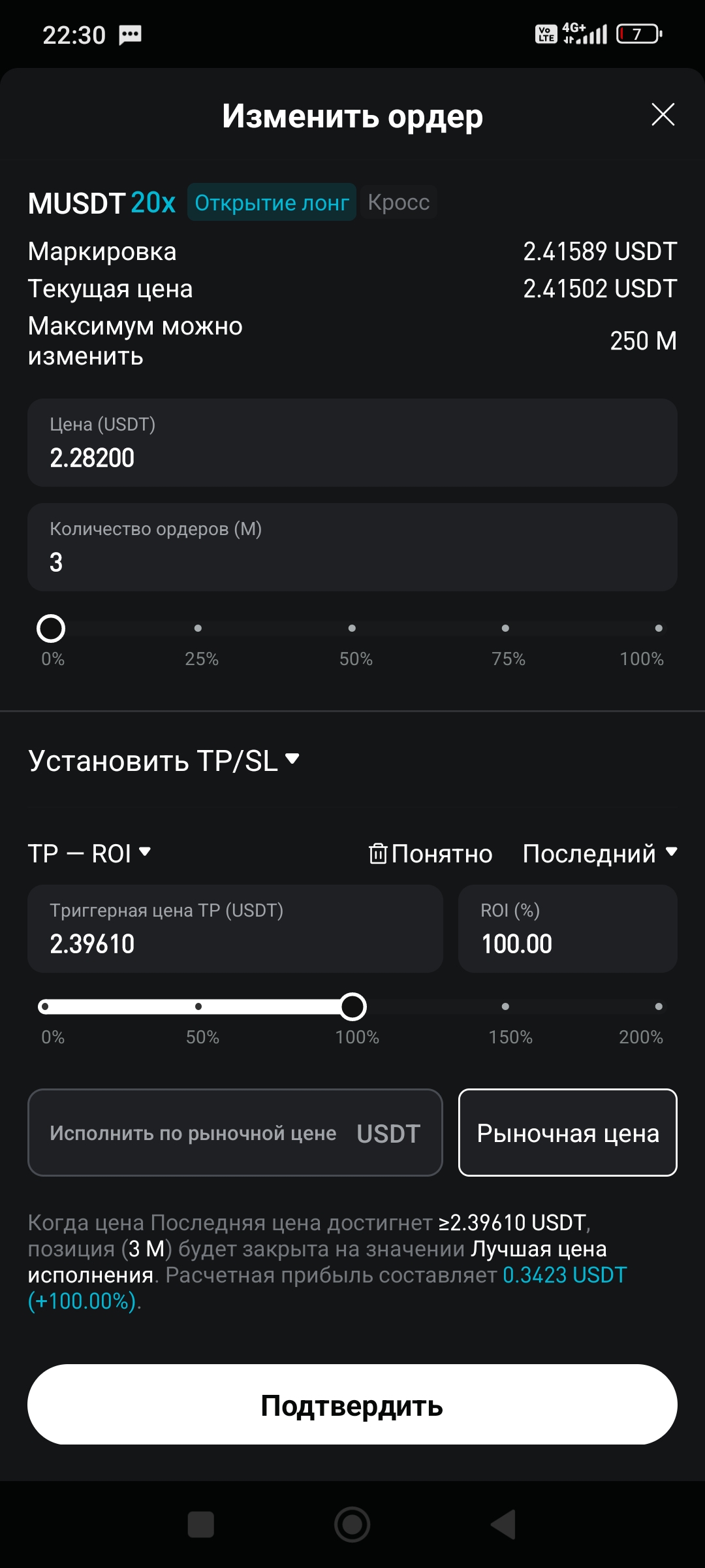 Сделал плечо 20. Неудачно добавился, но стоимость ордера повысил, 20% всё-таки зафиксировал. Всего ода пятая, что мне нужно сегодня. В целом - то ок и кредит обновил, проценты не будут геометрически нарастать. Теперь жду выход из этого окна в любую сторону и повышу стоимость ордера на 75% прибыли (остальное звяк в копилку USDT)