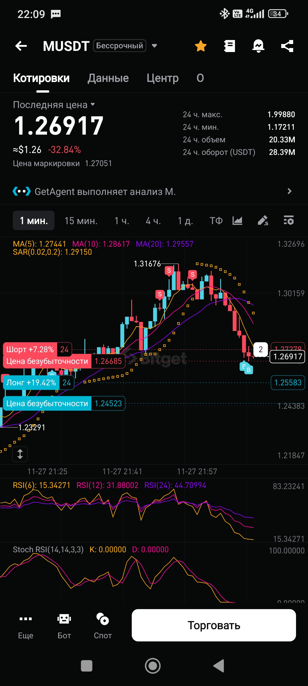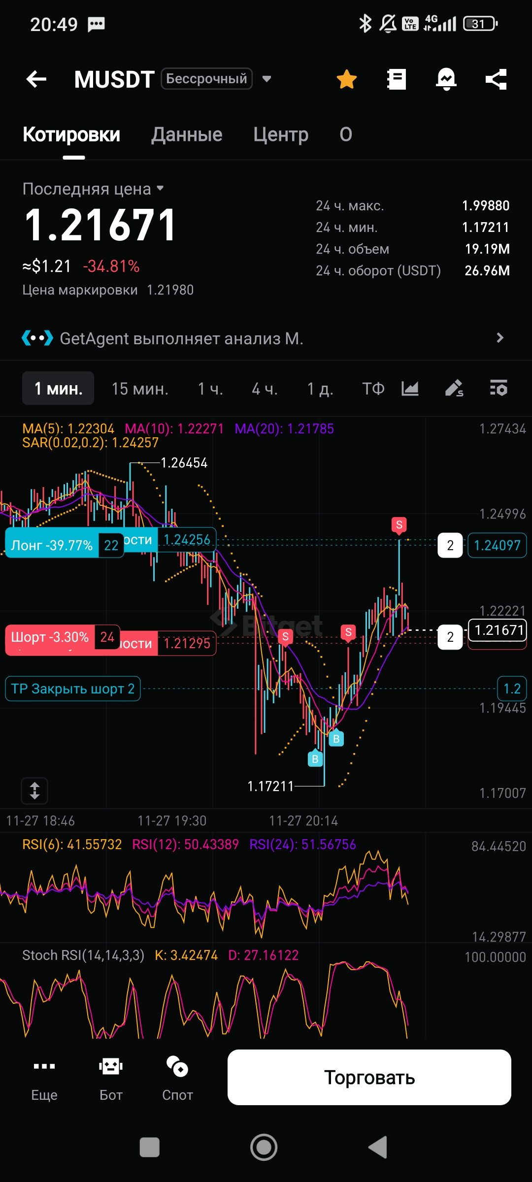 В общем, расставил лимитки с тейками по сценарию 2, ну а в случае сценария 1 они просто не сработают и хуй с ними. Стопы, как обычно, для слабаков и не нужны. Ещё есть сценарий 3 - боковик с не очень большими колебаниями, тогда я просто насыплю рандомное количество USDT в копилку. И сценарий 4 - ликвидация, но это надо ниже цены в 1 бакс уйти, т.к. риск я, всё таки буду понемногу повышать. Тут надо обдумать. Наверное, поставлю на единичке стоп-лосс и лимитку в лонг со стопом на 0,3 и буду потом лечить просадку депо.