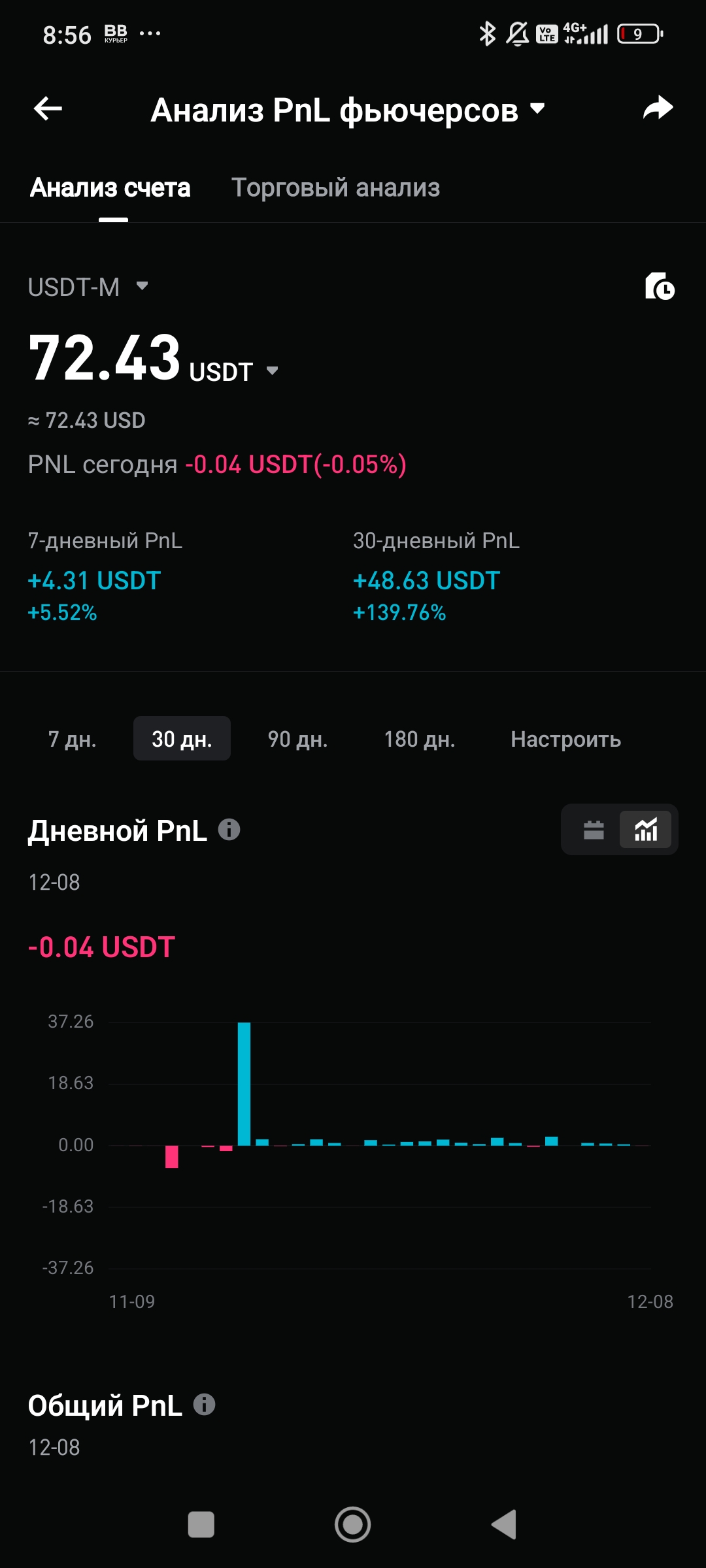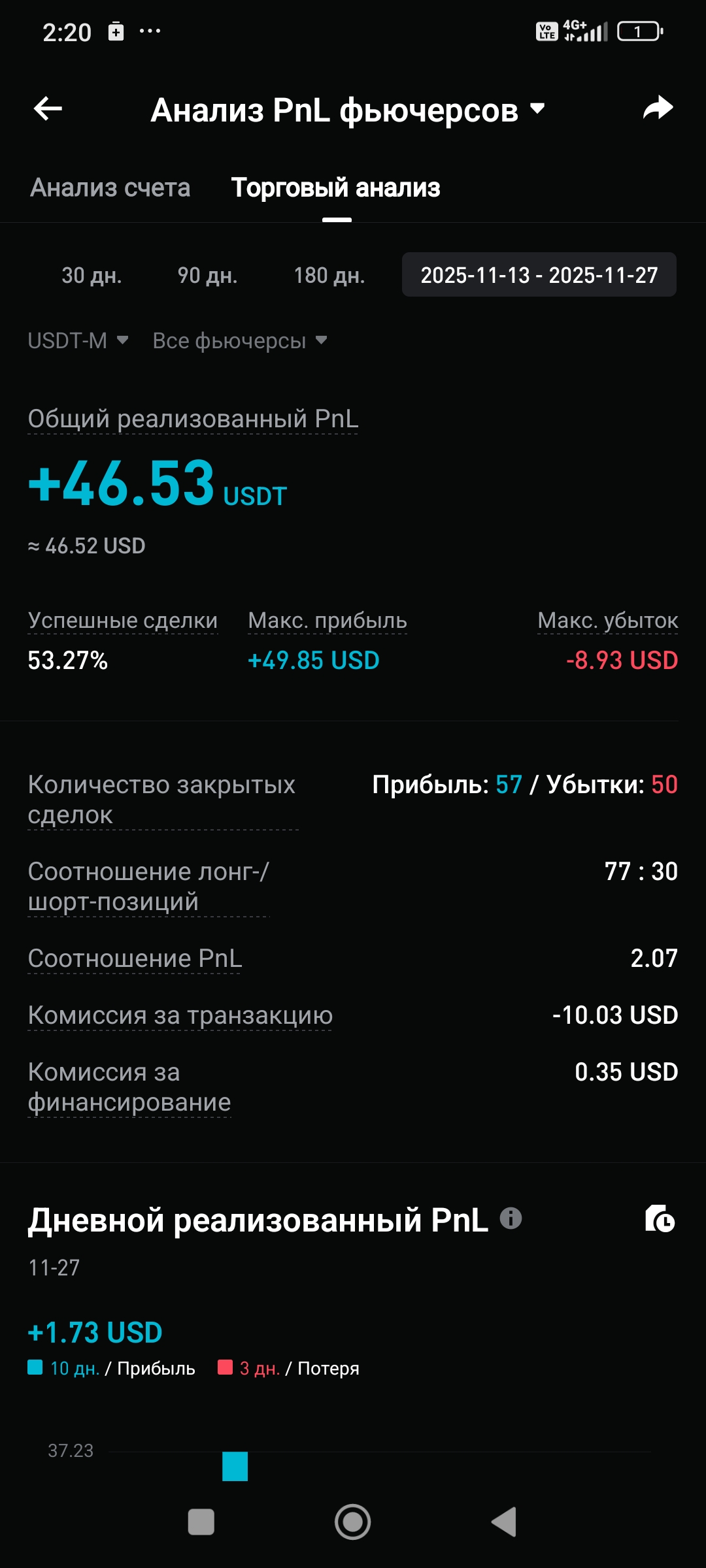Чутка подрастает деп неспеша, я по ходу уже не успею к 1 декабря дойти до сотки баксов. А всё дело в том, что с увеличением волатильности я снизил риски, ставлю лимитки дальше и меньшим объëмом. Ладно, рано или поздно дойдёт дело до флэта, можно будет ускорить темпы роста депа.