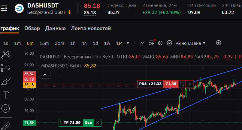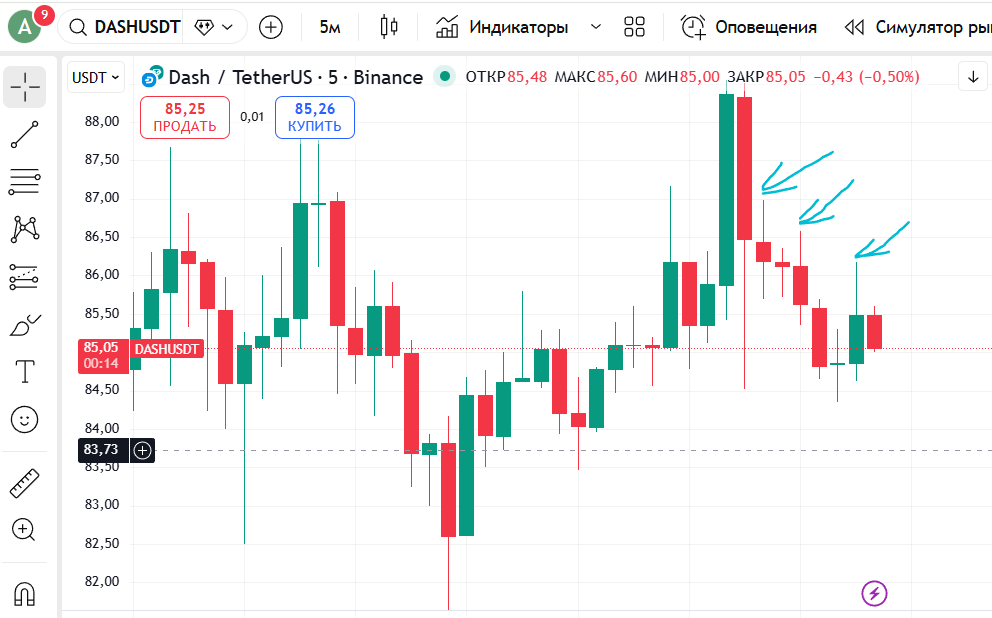 Ну вот мой пример сделки. Монета DASH - хорошая наклонка. 1% от капитала стоп за предыдущую тень свечи, стоп не ставлю, из стопа рассчитываю размер позиции, буду добавляться в шорт по мере роста. Тейк указан. Соотношение риск прибыль неплохое