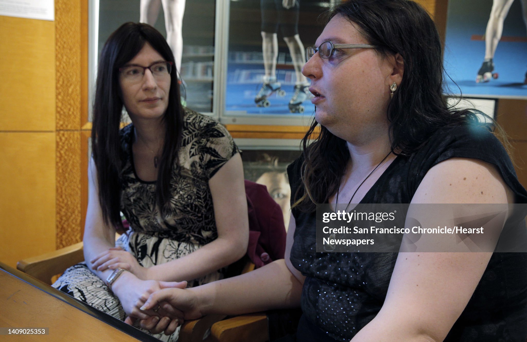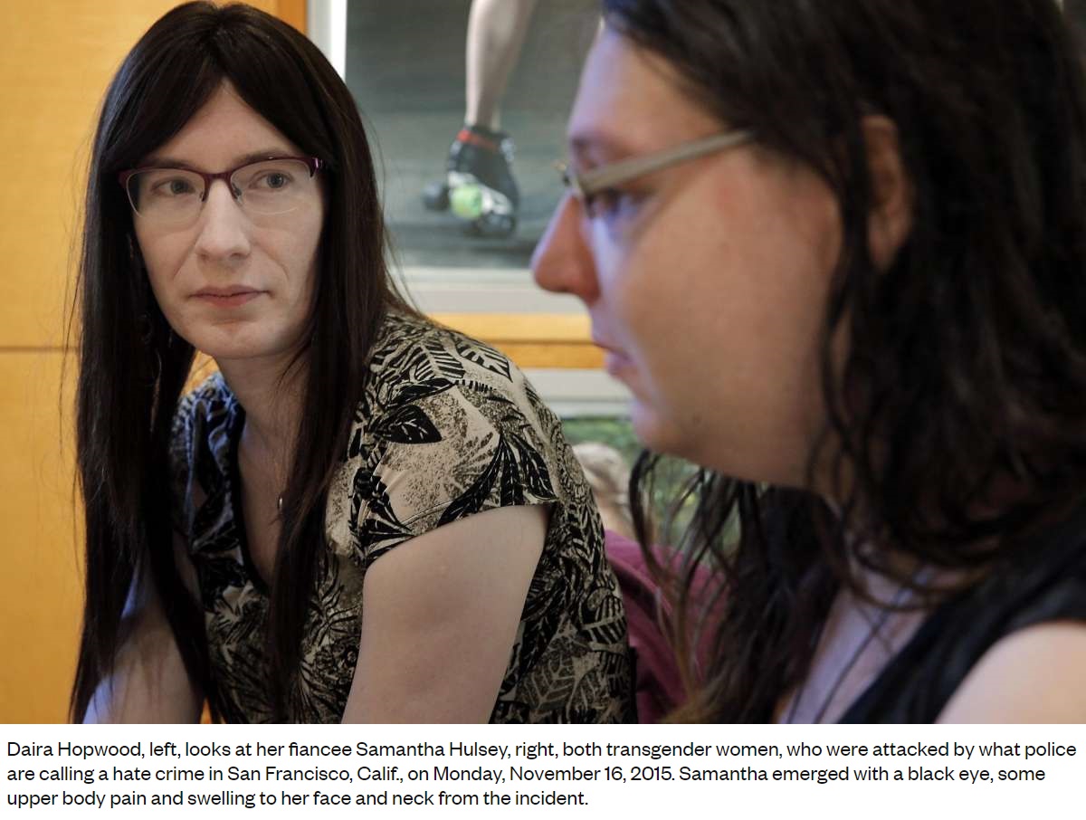 Samantha Hulsey, right, with her fiancee Daira Hopwood, left, both transgender women, who were attacked in what police are calling a hate crime in San Francisco, Calif., on Monday, November 16, 2015. Samantha emerged with a black eye, some upper body pain and swelling to her face and neck from the incident.