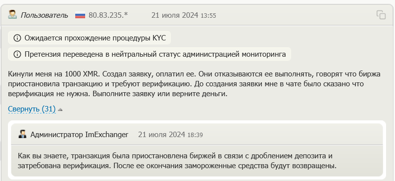 Я вышел из говнеры именно по этой причине, какой-нибудь эфир я могу на юнисвапе обменять на 1 000 000$ за секунду абсолютно не рискуя деньгами... На монере я с 1 000 000$ застряну на 1-2 недели с 50-ю обменами в заплупных обменниках каждый из которых может заморозить обмен. Чуть лучше если менять через анальную KYC биржу с полной верификацией но сообщество же добивается делистинга с бирж, хочет только залупные обменники.