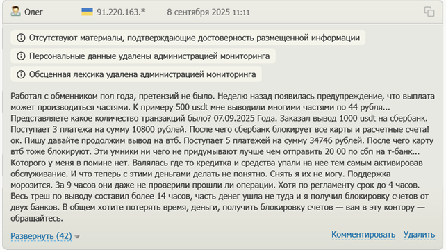 Если ты думаешь что дохуя умный, то почему такой нищий ? Не хватило мозгов заработать ? Все твои танцы с обменниками бессмысленны, ничего не мешает скам обменнику менять мелкие транзы но скамить на большие. Твои выводы об обменнике на основе "как поддержка реагирует" тоже весьма сомнительны. Ну и на карту принимают сейчас только хлебушки, то что тебя ещё банки не заблокировали лишь вопрос времени. Думаешь обменник каждый раз разового дропа держит чтоб твою мелочь разок разменять и не запалиться СБ. Меняют всем с одной, потом как дроп идёт по бороде всем контрагентам прилетают каскадные блокировки.