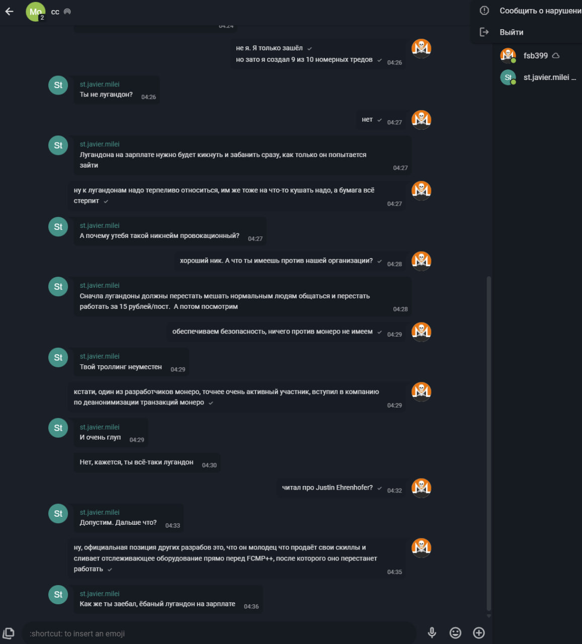 В общем, через пару часов, как я это написал >>1316088, в чат пришёл лугандон с провокационным никнеймом @fsb399, и с разбегу начал своими словами пересказывать, что он там недавно вычитал на доске /r/zec.