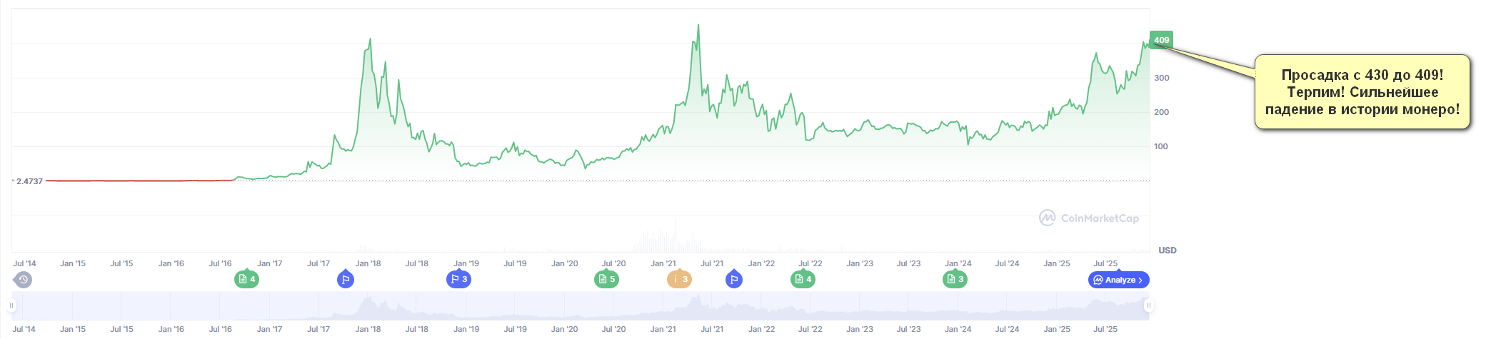 >>1321459 Можем легко уйти в боковичок опять лет так на 5. Болтаясь на 200-300. Лет через 7 возьмём тенью свечи 800-900. Но зато стабильно. В других монетах вообще обнуление. Не буду рассказывать о своём неудачном опыте покупки icp, avax, inj. Я уже не говорю о clore, chia и старкнет, которые на этой доске мощно пиарили. Почти везде я со временем получаю -50%. Терплю, я же не бумажные ручки. Потом -70%. Потом -90. И понимаю, что уже выводить особо то и нечего, я просто пооебал бабки и меня прогрели. В монеро я чувствую себя спокойно и меня не обнуляют.