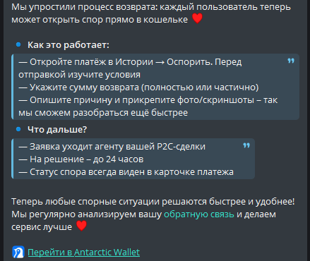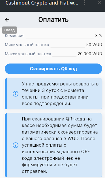 Antarctic Wallet: https://antarcticwallet.com/ https://t.me/antarcticwallet — Есть комиссии на пополнение в USDT, нет комиссий по оплате QR. Есть KYC на вывод фиата и оплаты мобильной связи, есть AML. — Нет пополнения через смарт-контракт, такое зачисление уйдет в долгий ручной ввод. — Можно так же пополнять Steam (RU аккаунт) по курсу 1USDT=$1, комиссия - $0.5. — Быстрое пополнение с байбит. Оплата по QR-коду проходит в течение 10 сек.