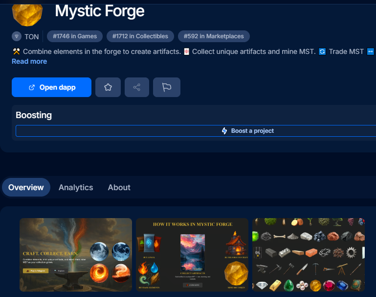 Суть такова... Алхмик\Doodle God в крипте, на платформе TON. Возможно ктото из вас вспомнит RPlanet на wax'е..... В дальнейшем возможны новые выходы на другие платформы кстати... есть токен, генерируется артефактами, за токен можно покупать элементы и крафтить из этих элементов новые элементы, угадывая нужный рецепт (первооткрывателю рецепта даётся награды особые, плюс первые скрафтившие этот новый элемент получают новые артефакты этого элемента). Ну и вот, в общемто, суть вкратце. А детальней надо читать документалку https://mysticforgegame.com/docs/ и конечно чтобы быть в курсе новостей - подписать на канал \ зайти в чат https://t.me/mysticforgegame/68