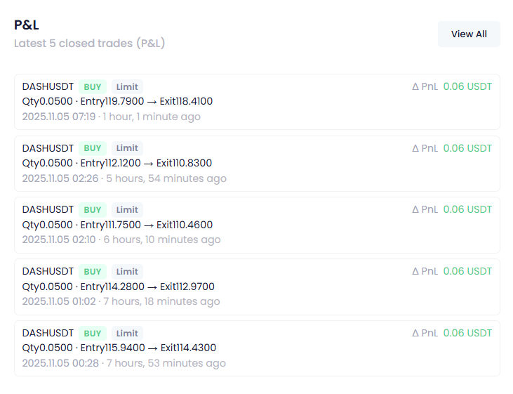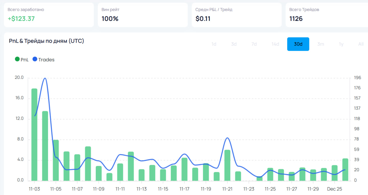 >>1316911 Стартовый баланс примерно 100 $ итог за 30 дней→ 123 $ Пока рынок в крови на отставке Пауэлла — бот просто печатает PnL (При этом хочу напомнить, бот пережёвывает даже самую лютую бычку благодаря строгому рискменеджменту)