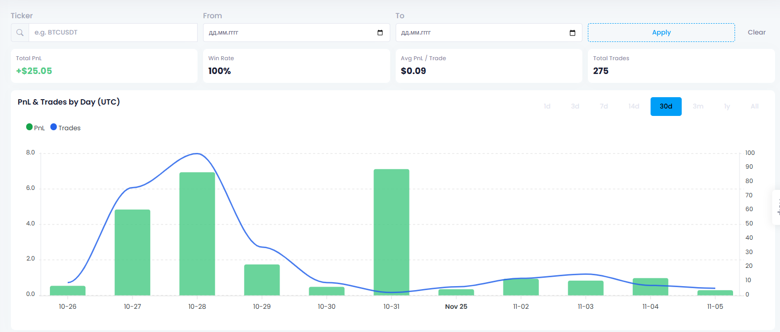 >>1305873 Реализовали статистику работы ботов в виде удобных графиков и таблиц с самыми профитными сделками Интересно что монета zec за октябрь отторговалась в шорт 41 раз и принесла целых 8 баксов прибыли.