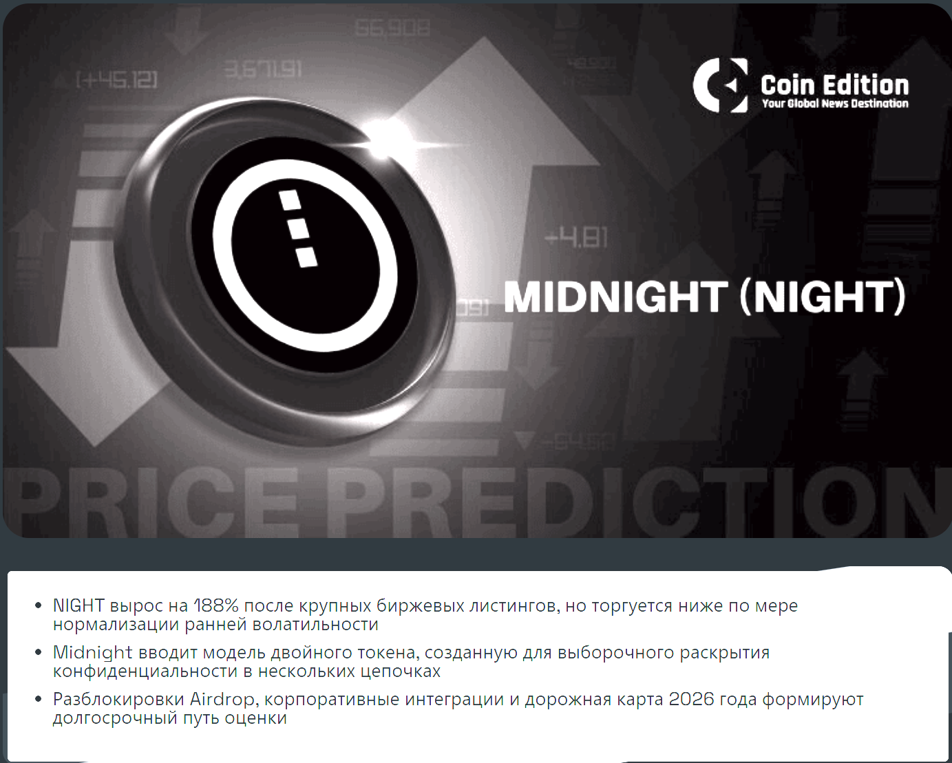 >>195978 (OP) Речь пойдет о новом токене(проекте) NIGHT от компании Cardano Токен позволяет сделать часть смарт контракта приватной, что сейчас в тренде. В данный момент можно принять участие в аирдропе за стейкинг. APR 100% Проект вышел совсем недавно и уже привлек внимание крупных спонсоров, а именно google cloud Принять участие можно на https://www.gate.com/ru/candy-drop/detail/NIGHT-218?ref=VLNGVVXEAW&ref_type=123&utm_cmp=iK6QnjCQ