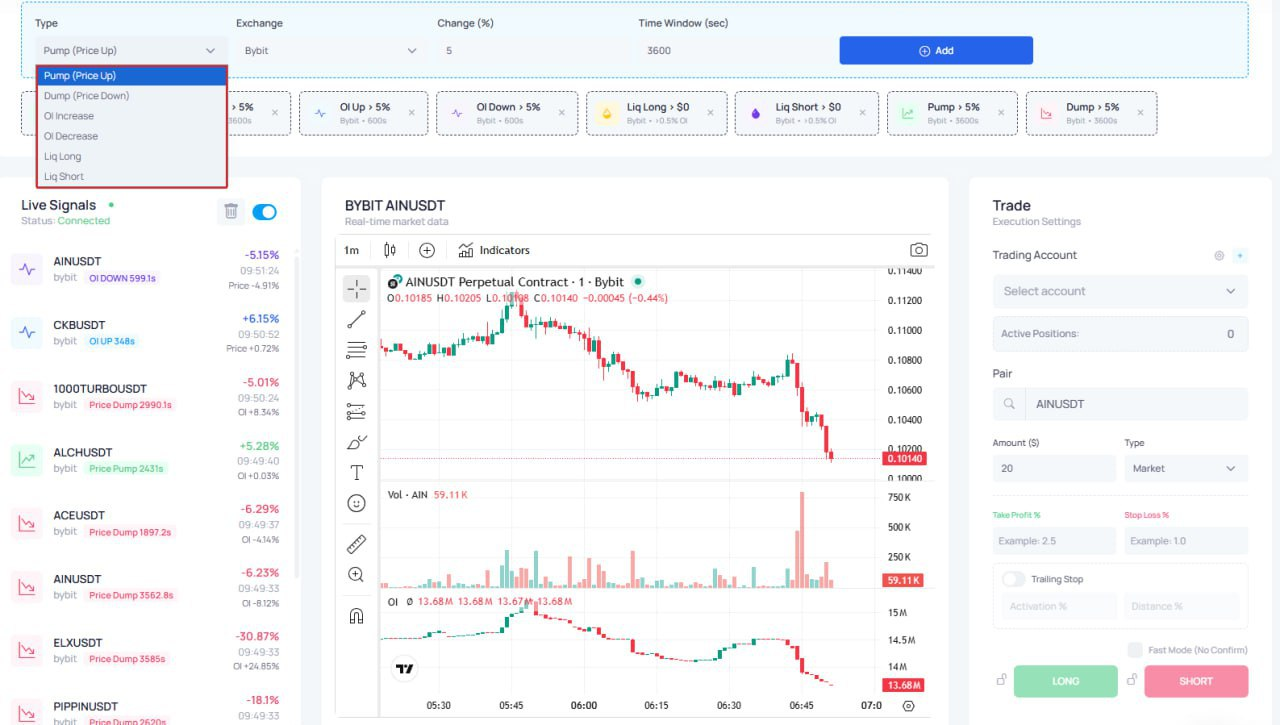 >>1319628 Не доверяешь ботам? Специально для ручных трейдеров запущен новый функционал - скринеры пампов, дампов, открытого интереса и ликвидаций. Но главное преимущество скринеров платформы в том, что всё объединено в один контур, сделка в 1 клик не открывая терминал биржи. Пришёл сигнал. Оценил на графике трейдингвью. Выставил тп и жми одну кнопку. Сделка автоматом пробросится в твой аккаунт по АПИ без права вывода.