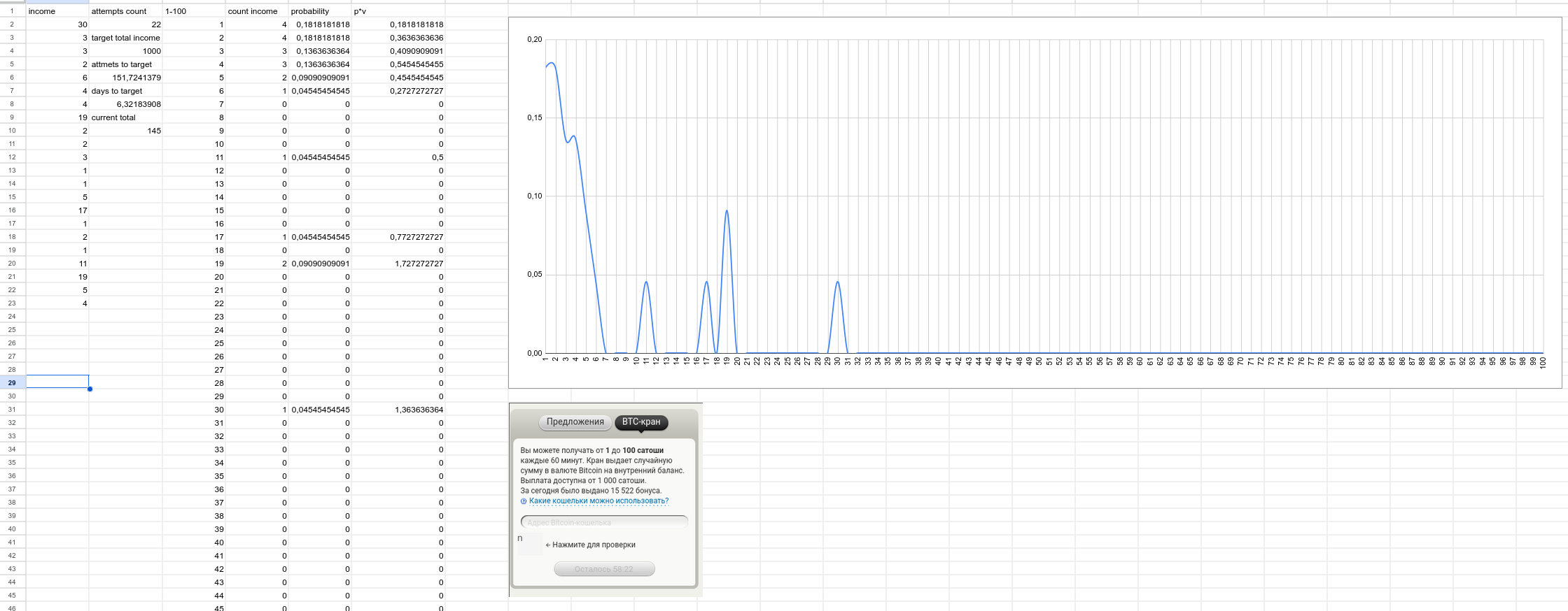> Вы можете получать от 1 до 100 сатоши каждые 60 минут> Выплата доступна от 1 000 сатоши (34 рубля)Ну, я конечно не мог пройти мимо такой шедрости. Заодно решил узнать, с каким распределением падает случайная награда. И вот что получилось: