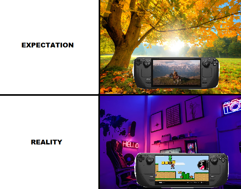 Q: Где и как купить этот ваш этот стимдек? A: Ozon, WB, DNS, Авито или любой другой магазин или продавец с отзывами. Будь внимателен и не торопись, цена на одну и ту же версию в разных местах может отличаться чуть ли не в три раза. Q: Какой объём брать? A: 256Гб хватит если играть по две-три игры за раз, ещё для индюшатины место останется. Берёшь 64Гб — сразу бери SSD на замену (её сделать довольно просто), WD-SN740 или Samsung pm991 к примеру. Либо докупай качественную SD-карточку, например SanDisk Extreme Pro либо Samsung Pro Plus. Q: В ААА не поиграть? A: Поиграть. Относительно свежие ААА дают 30 кадров и более в средне-низких. Недавно завезли losless scaling. Q: Сколько держит батарея? A: Зависит от выставленных настроек фпс, TDP, яркости и самой игры. От 1.5ч в традиционно неоптимизированном кАААле до 6ч и более в безграфонном инди. OLED-версия живёт от батареи на 10-20% дольше. Q: Как устанавливать пиратские игры? A: Перенести установленную (или портабл) папку с игрой с компутера на дек и "добавить" её EXE-файл в Steam. Способов переноса несколько, гугл в помощь. Либо поставить на дек торрент-клиент и скачать игорь сразу туда. Q: Закатил в дек пиратку, а она лежит в библиотеке серым кирпичом, хочу обложечку! A: Ставишь decky — сборник плагинов. В нём SteamGridDB — плагин для удобного навешивания артов и обложек. И ещё много всякого. Q: Эмуляцию завезли? A: Естественно. Есть отдельные эмуляторы во встроенном магазине приложений (где всё бесплатно), есть Emudeck. Все основные эмуляторы в нём уже есть. PS3 эмулируется так себе, от игры к игре, Switch эмулируется неплохо, 40 кадров наберётся. Q: Хочу установить Шиндошс / переустановить SteamOS! A: Дек прекрасно загружается с флэшки, шаманишь Rufus'ом, втыкаешь в консоль через OTG-адаптер и вперёд. Можно сделать дуалбут, но придётся делить SSD на две части. Q: Он тяжёлый? A: Тяжелее большинства портативок, но отличная эргономика и продуманный дизайн делают своё дело, дискомфорта при долгой игре нет. Q: Заведётся ли игра_нэйм на деке и будет ли нормально работать? A: https://www.protondb.com/explore, но с вероятностью 99.9% всё заведётся и работать будет. Q: А вот посмотрите [очередной_стопицотый_"УБИЙЦАстимдека"], он жи лутьши))) А: Отлично, мы за тебя рады, пройди в тред по нему, а если нет - создай. Q: Что насчёт Стимдек-2? Когда будет? Что внутри? Может, подождать его? А: На данный момент кроме слухов ничего нет. По словам вальвы новый дек выйдет только когда будет прорыв в технологиях. Ждать смысла нет, текущий стимдек отлично держится и будет держаться ещё долго - играет эмуляторы и старьё, а немалая часть свежайших релизов имеет специально заточенный под него пресет настроек графики. Q: Ваша шапка гавно, у меня ещё куча вопросов! A: Как ни странно, гугл. Одно из (можно сказать, решающих) преимуществ дека — огромное и активное коммьюнити в стиме, реддите и куче других сайтов, а ещё триллиард видев на slowтюбе. С вероятностью 101% твою проблему уже обсосали и решили.