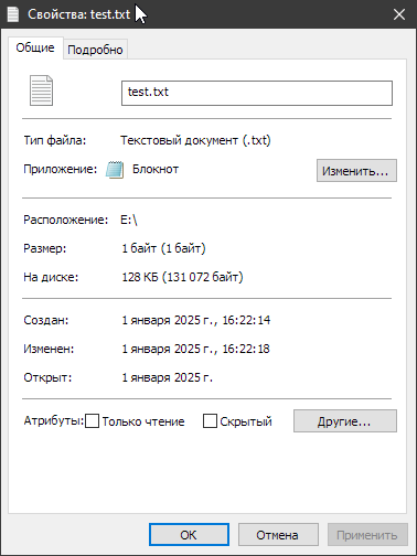 >>2464960 Я догадываюсь, что дело в этом, и что ФС выделяет под файл блоки, а не N байт, и фактически занимаемое место округляется по блокам, а не по целому числу килобайт. Я просто думал там хотя бы 64КБ блоксайз, а не 128.