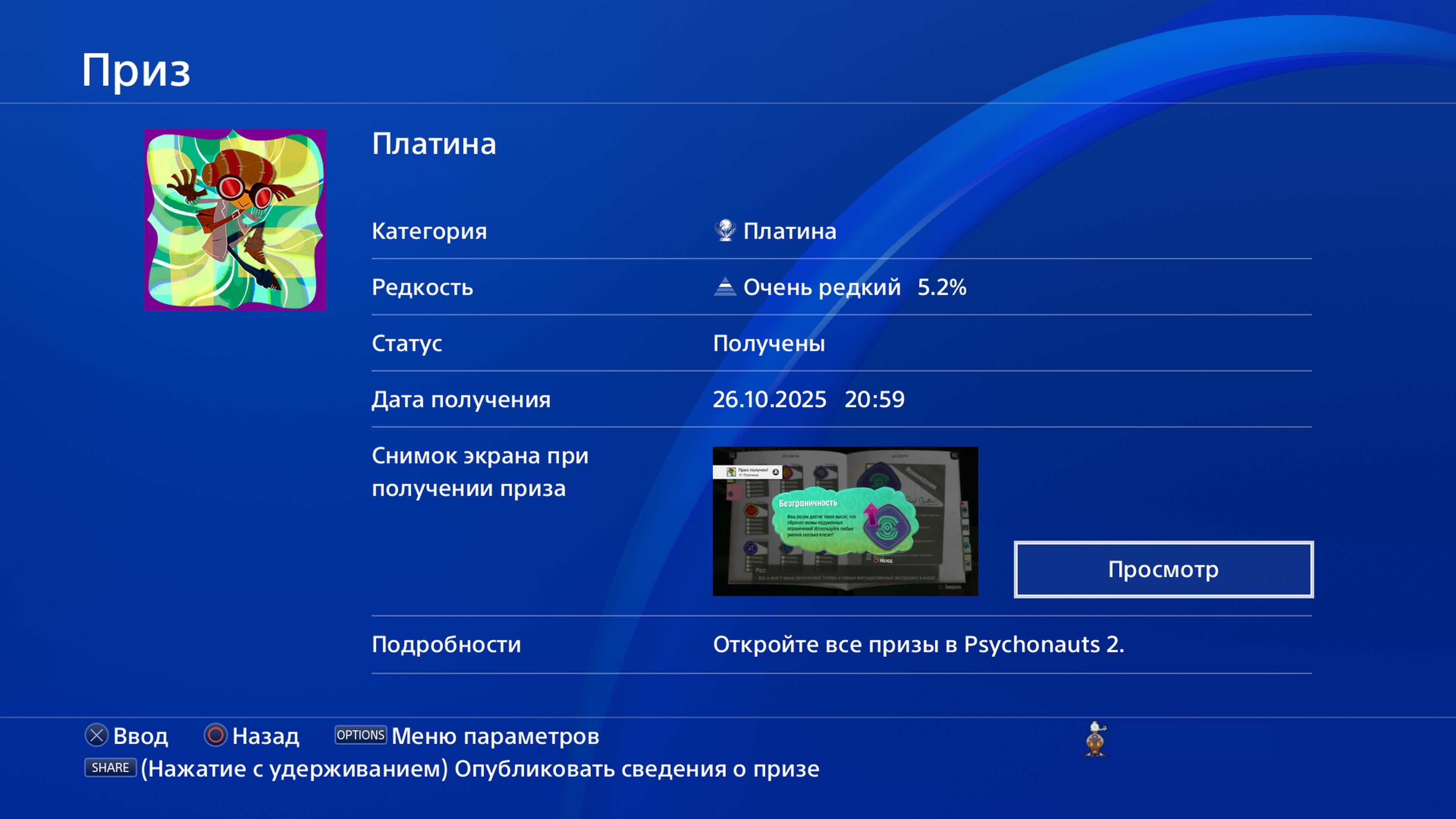 Первая часть, в моих воспоминаниях, была более ламповая и интересная. Там были классные уровни вроде молочника, поля для варгейма и мясного цирка. В её простом графоне был какой то свой шарм. Во второй же негры, пидоры, сильные женщины, опенворлд и невзрачные уровни. Единственный плюс это завершили сюжет первой части. Вобщем обычная безопасная игра от крупного издателя. Пока Тим Шейфер не продал свою жопу майкам, игры у него были смелее. Платина лёгкая. Уровни разбиты на подуровни где показывается что ты пропустил. Плюс есть детектор мыслей и багажа. В первой части найти все мысли было тем ещё адом, здесь же без проблем. Хотя кмк и уровни стали меньше и самих мыслей тоже.