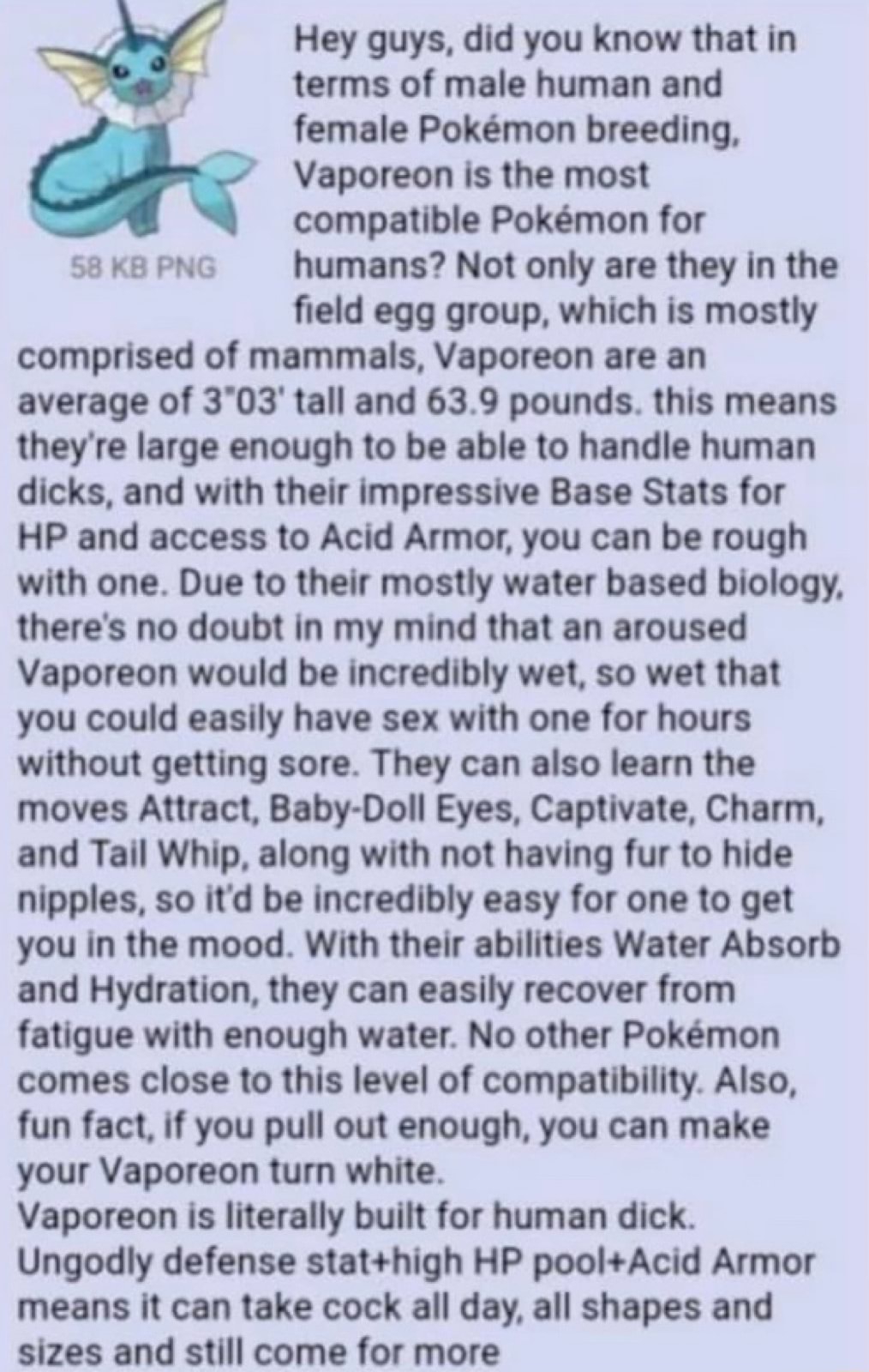 >>2527612 >>2527614 Hey guys, did you know that in terms of male human and female Pokémon breeding, Vaporeon is the most compatible Pokémon for humans? Not only are they in the field egg group, which is mostly comprised of mammals, Vaporeon are an average of 3”03’ tall and 63.9 pounds, this means they’re large enough to be able handle human dicks, and with their impressive Base Stats for HP and access to Acid Armor, you can be rough with one. Due to their mostly water based biology, there’s no doubt in my mind that an aroused Vaporeon would be incredibly wet, so wet that you could easily have sex with one for hours without getting sore. They can also learn the moves Attract, Baby-Doll Eyes, Captivate, Charm, and Tail Whip, along with not having fur to hide nipples, so it’d be incredibly easy for one to get you in the mood. With their abilities Water Absorb and Hydration, they can easily recover from fatigue with enough water. No other Pokémon comes close to this level of compatibility. Also, fun fact, if you pull out enough, you can make your Vaporeon turn white. Vaporeon is literally built for human dick. Ungodly defense stat+high HP pool+Acid Armor means it can take cock all day, all shapes and sizes and still come for more