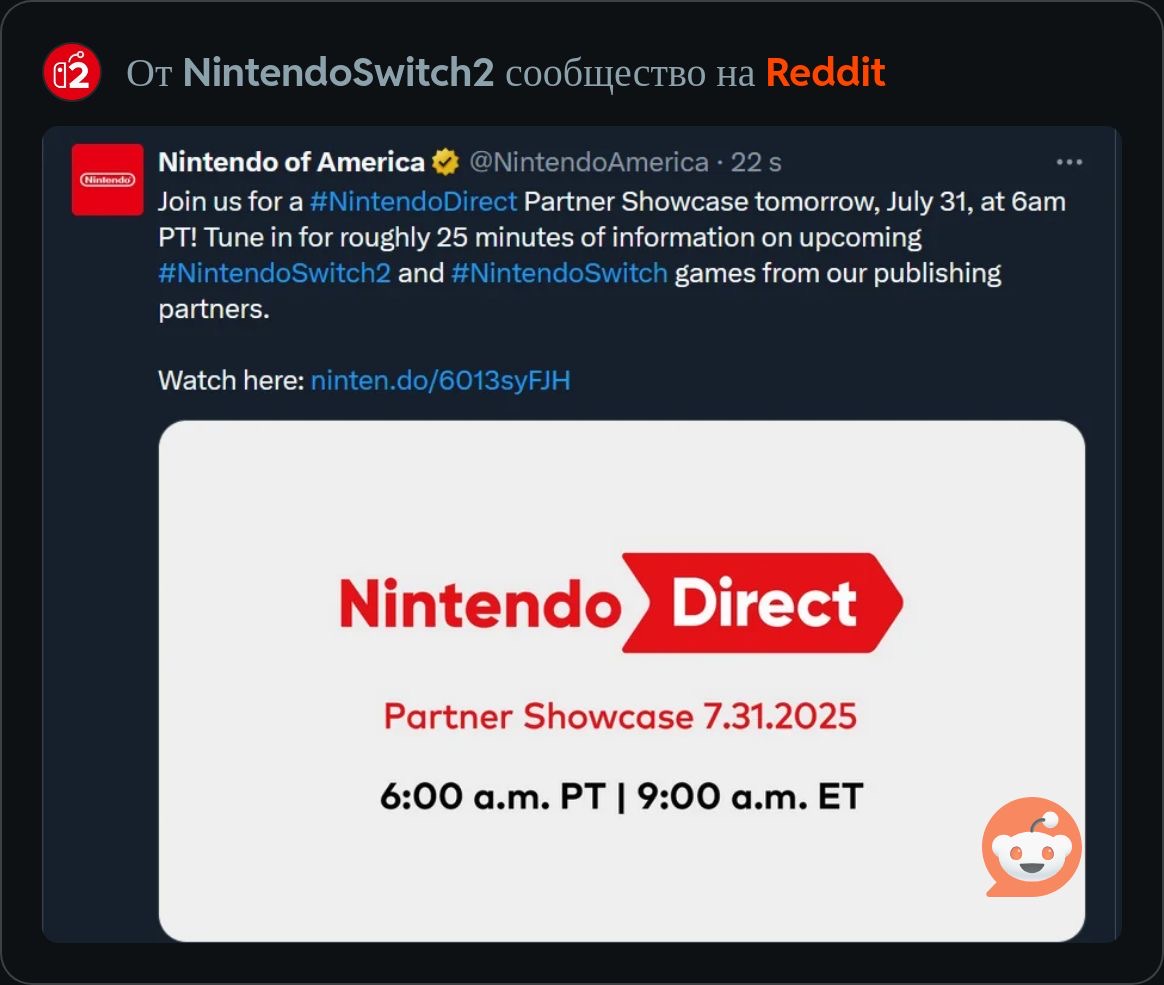 Ну что, дождались? Директ (презентация игр) состоится завтра, в 16:00 МСК. Разумеется, будем смотреть вместе) Впрочем, как видно из названия, это партнёрский Директ. А значит, игр от самой Нинтендо на нём не будет, и мы так и не узнаем, когда же выйдет Metroid Prime 4. P.S. Особо смешно, что примерно за полчаса до этого анонса появилась новость, что Директ перенесли на август. Инсайдеры такие инсайдеры...