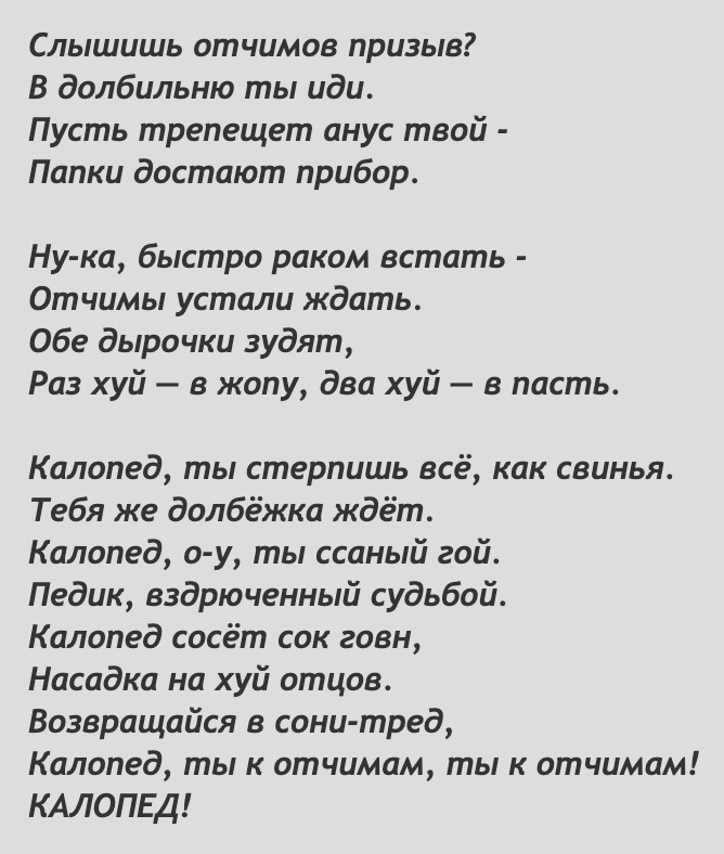 Калопед, ты стерпишь всё, как свинья. Тебя же долбёжка ждёт. Калопед, о-у, ты ссаный гой. Педик, вздрюченный судьбой. Калопед сосёт сок говн, Насадка на хуй отцов. Возвращайся в сони-тред, Калопед, ты к отчимам, ты к отчимам! КАЛОПЕД!
